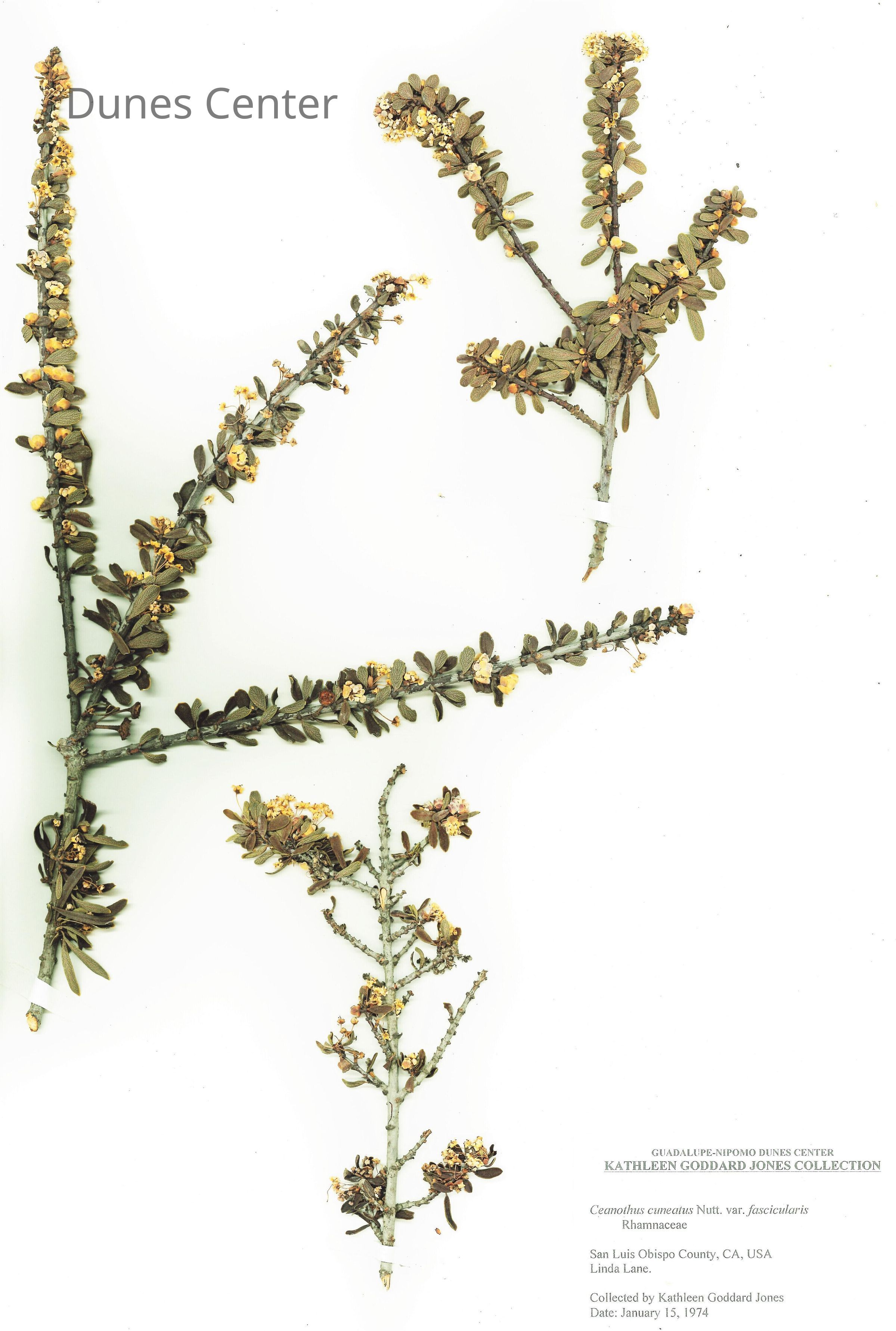Common Names: Sand Buck Brush, Sedgeleaf Buckbrush Scientific Name: Ceanothus cuneatus (Hook.) Nutt. var. fascicularis (McMinn) Hoover Family: Rhamnaceae San Luis Obispo County, CA, USA Linda Lane. Collected by Kathleen Goddard Jones Date: January 15, 1974Collection