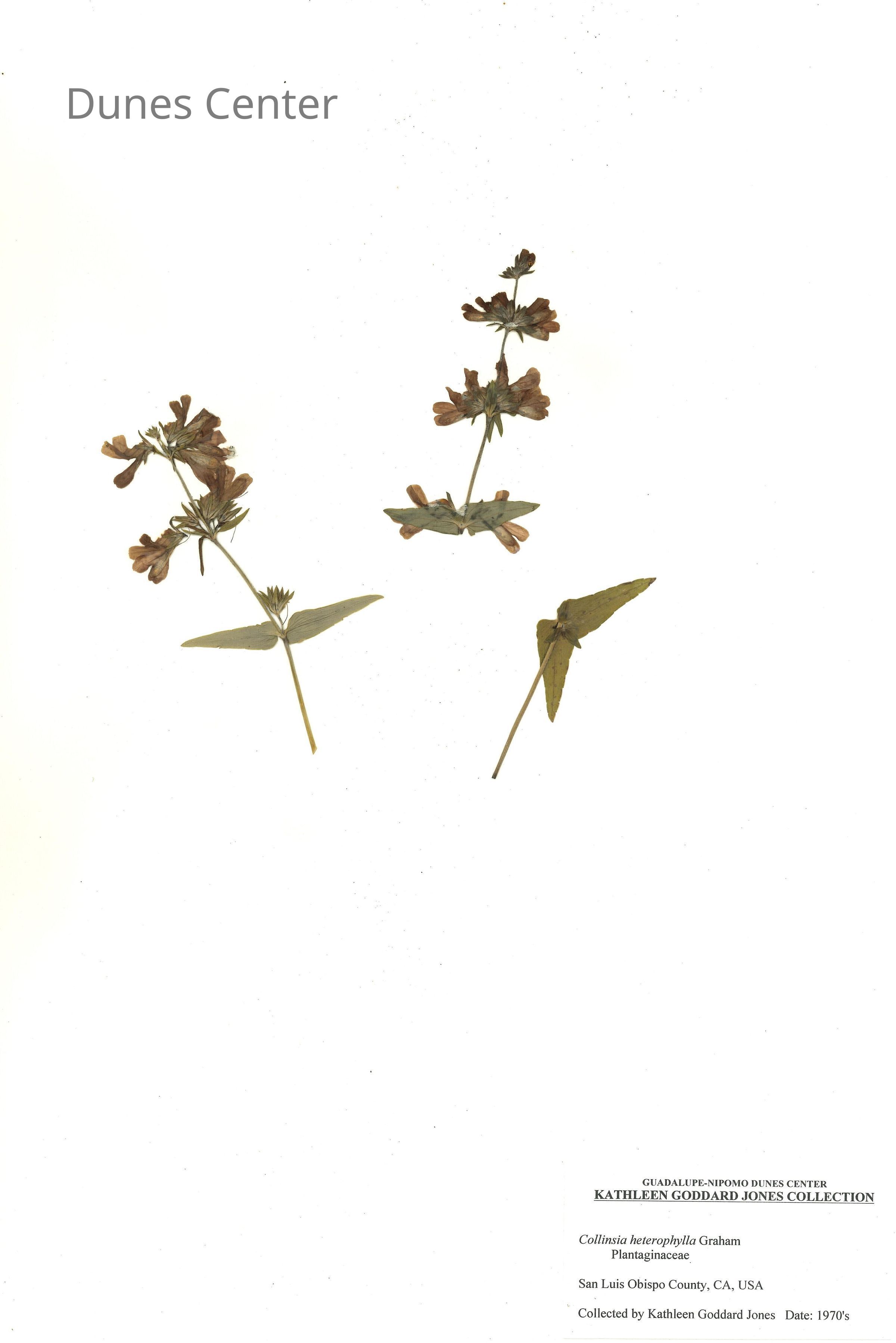 Common Name: Purple Chinese Houses Scientific Name: Collinsia heterophylla Buist ex Graham Family: Plantaginaceae San Luis Obispo County, CA, USA Collected by Kathleen Goddard Jones Date: 1970'sEntry/Object ID