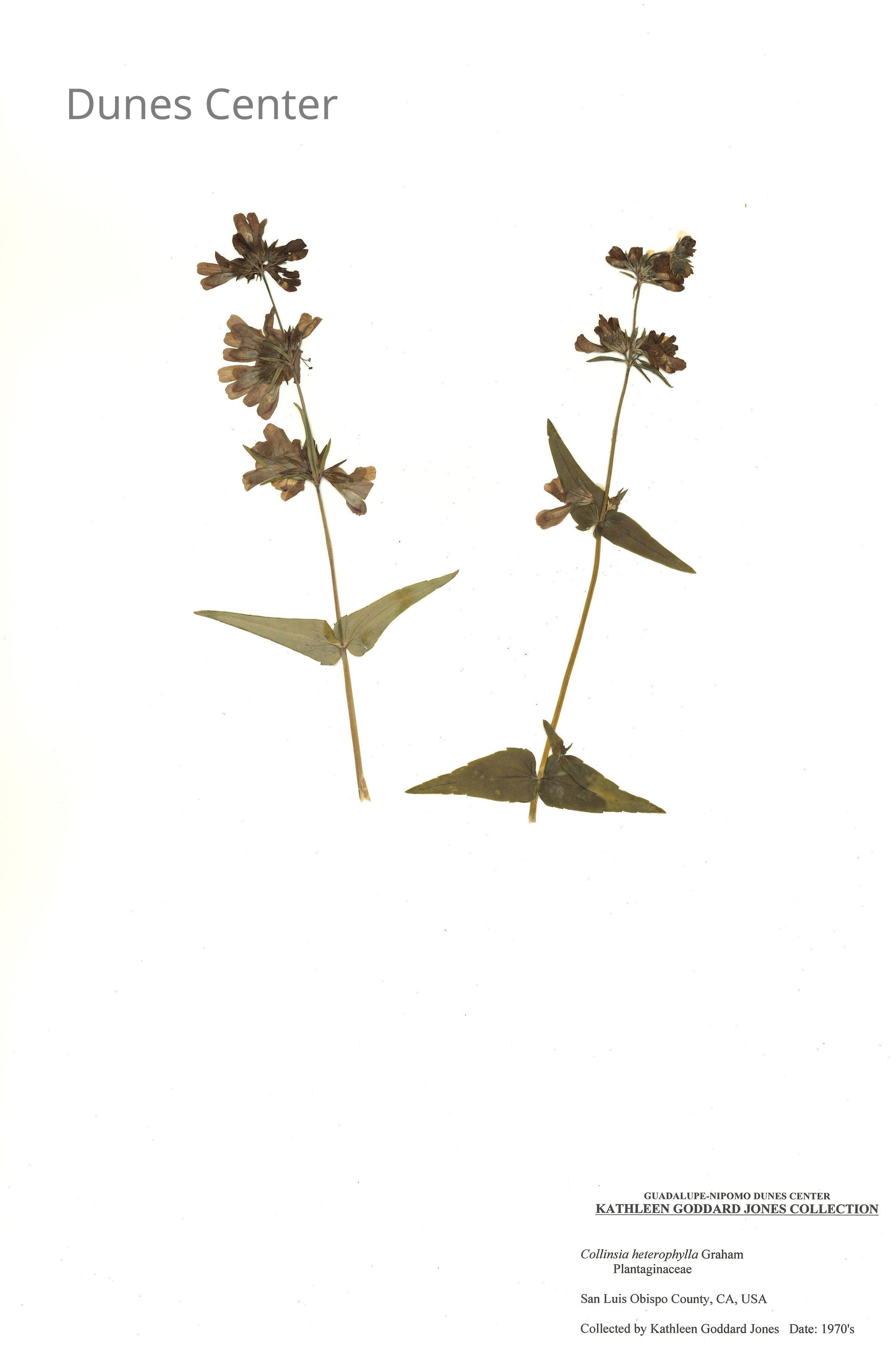 Common Name: Purple Chinese Houses Scientific Name: Collinsia heterophylla Buist ex Graham Family: Plantaginaceae San Luis Obispo County, CA, USA Collected by Kathleen Goddard Jones Date: 1970'sEntry/Object ID