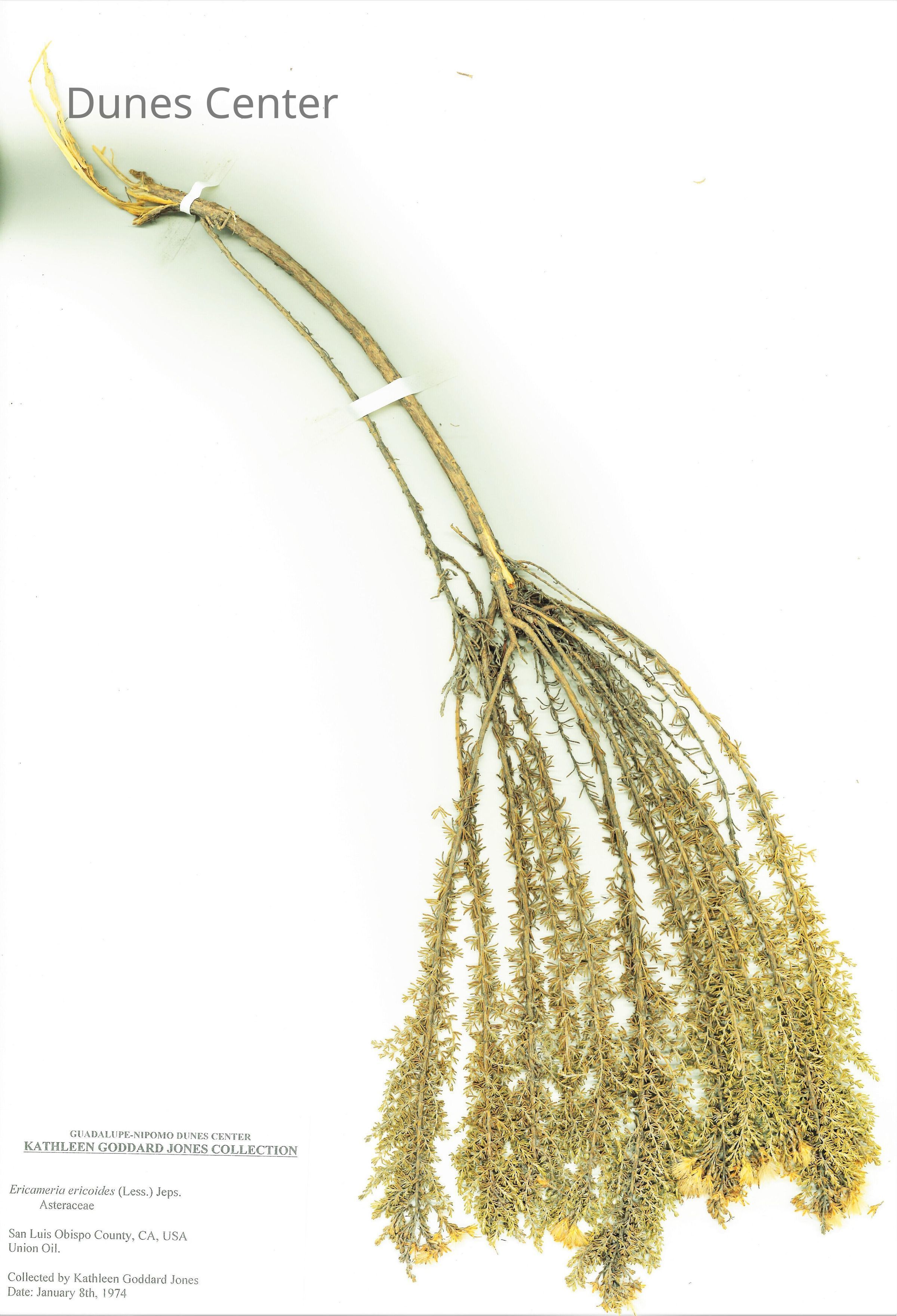 Common Names: California Goldenbush, Mock Heather Scientific Name: Ericameria ericoides (Less.) Nutt. ex Jeps. Family: Asteraceae San Luis Obispo County, CA, USA Union Oil. Collected by Kathleen Goddard Jones Date: January 8th, 1974Collection