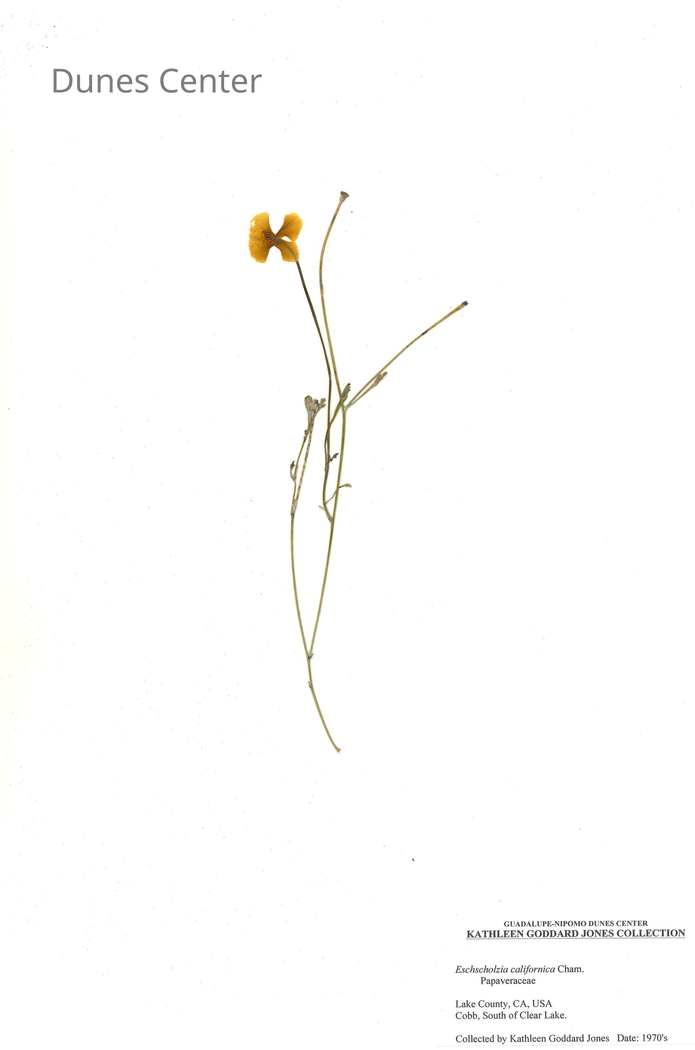 Common Name: California Poppy Scientific Name: Eschscholzia californica Cham. Family: Papaveraceae Lake County, CA, USA Cobb, South of Clear Lake. Collected by Kathleen Goddard Jones Date: 1970'sCollection
