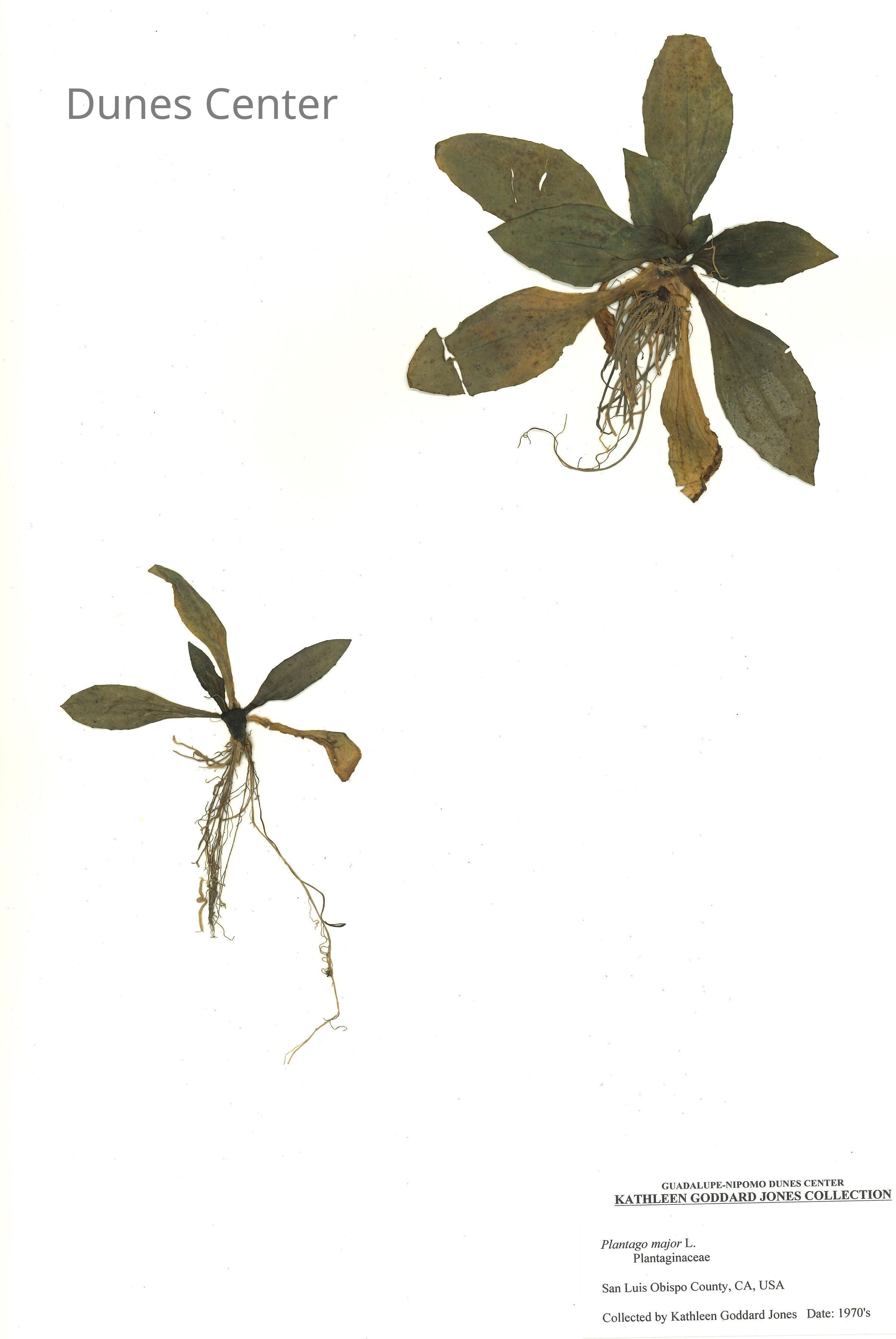 Common Name: Common Plantain Scientific Name: Plantago major L. Family: Plantaginaceae San Luis Obispo County, CA, USA Collected by Kathleen Goddard Jones Date: 1970'sCollection