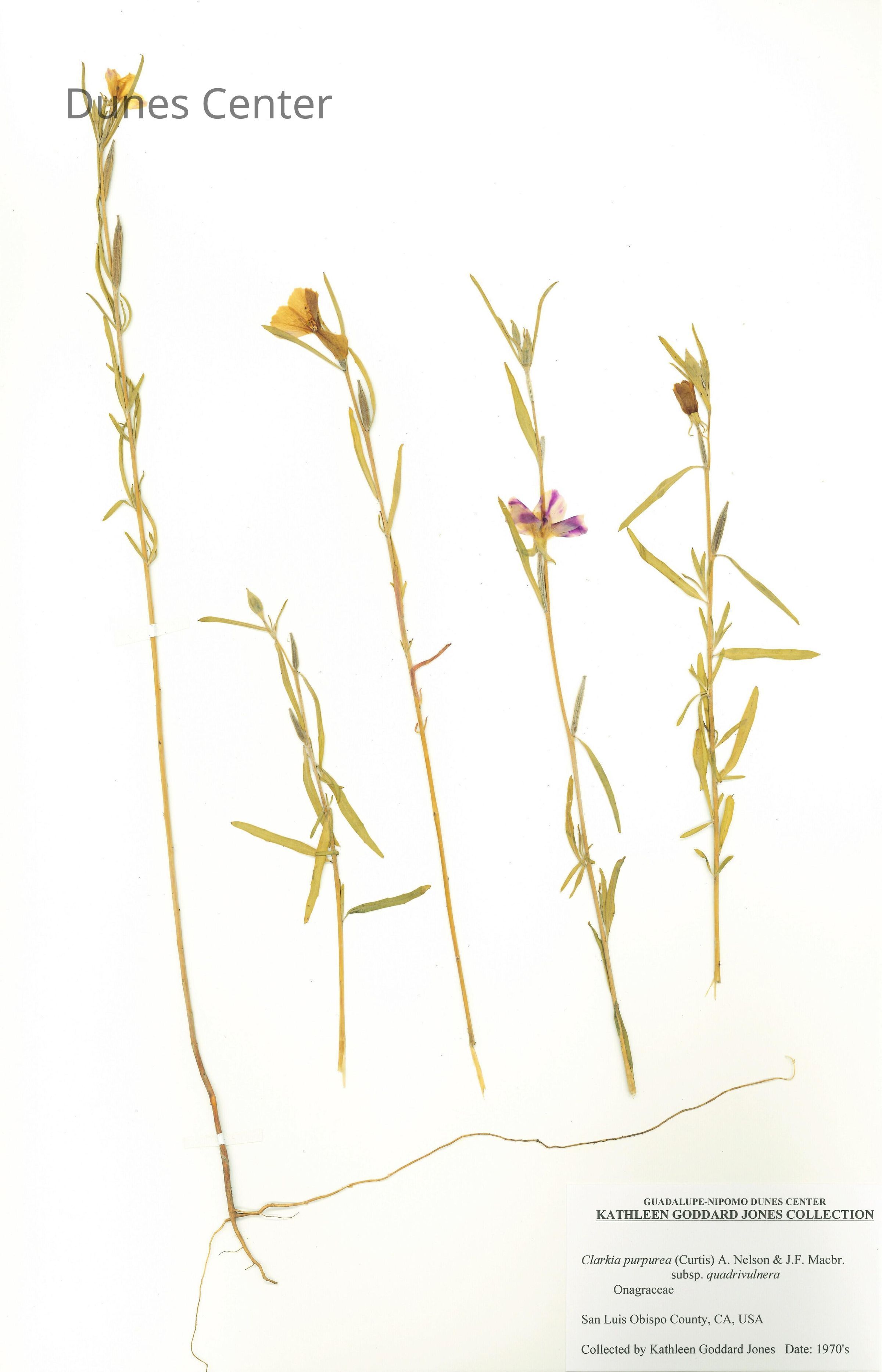 Common Names: Winecup Clarkia, Purple Clarkia Scientific Name: Clarkia purpurea (Curtis) A. Nelson & J.F. Macbr. subsp. quadrivulnera Family: Onagraceae San Luis Obispo County, CA, USA Collected by Kathleen Goddard Jones Date: 1970'sCollection