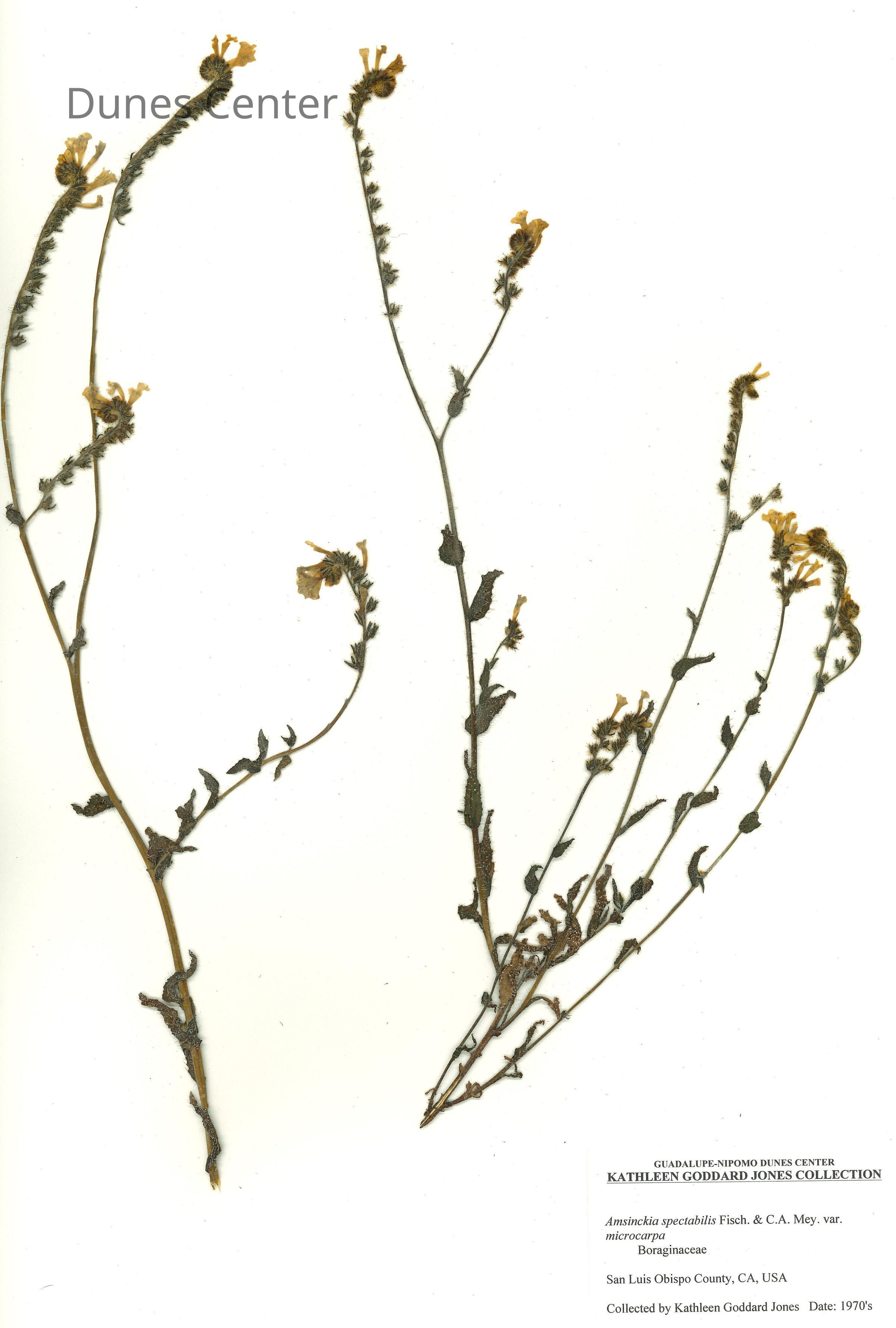 Common Names: Seaside Fiddleneck, Woolly Breeches Scientific Name: Amsinckia spectabilis Fisch. & C. A. Mey. Family: Boraginaceae San Luis Obispo County, CA, USA Collected by Kathleen Goddard Jones Date: 1970'sCollection