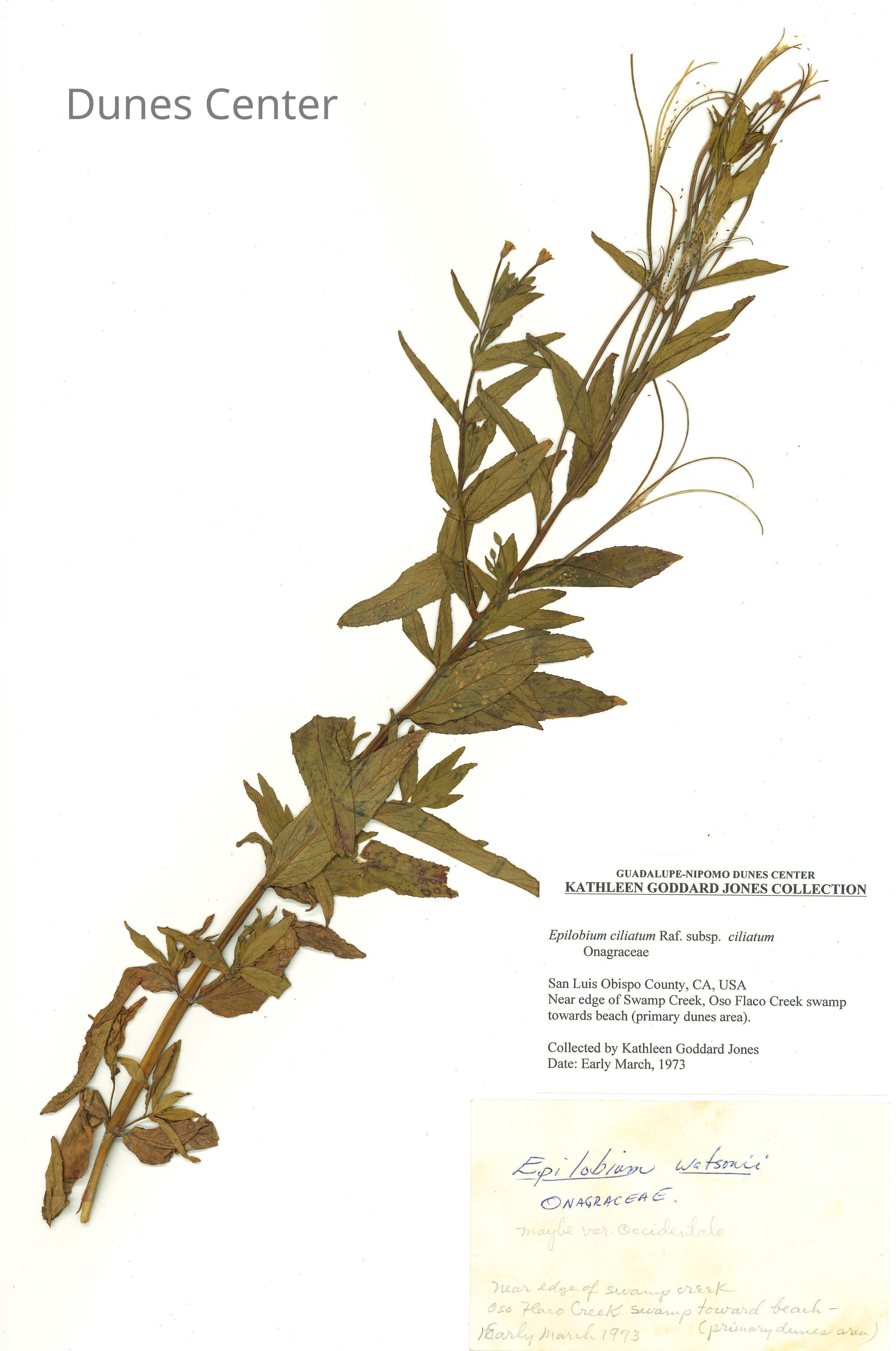 Common Names: Fringed Willowherb, Northern Willowerb Scientific Name: Epilobium ciliatum Raf. ssp. ciliatum Family: Onagraceae San Luis Obispo County, CA, USA Near edge of Swamp Creek, Oso Flaco Creek swamp towards beach (primary dunes area). Collected by Kathleen Goddard Jones Date: Early March, 1973Collection