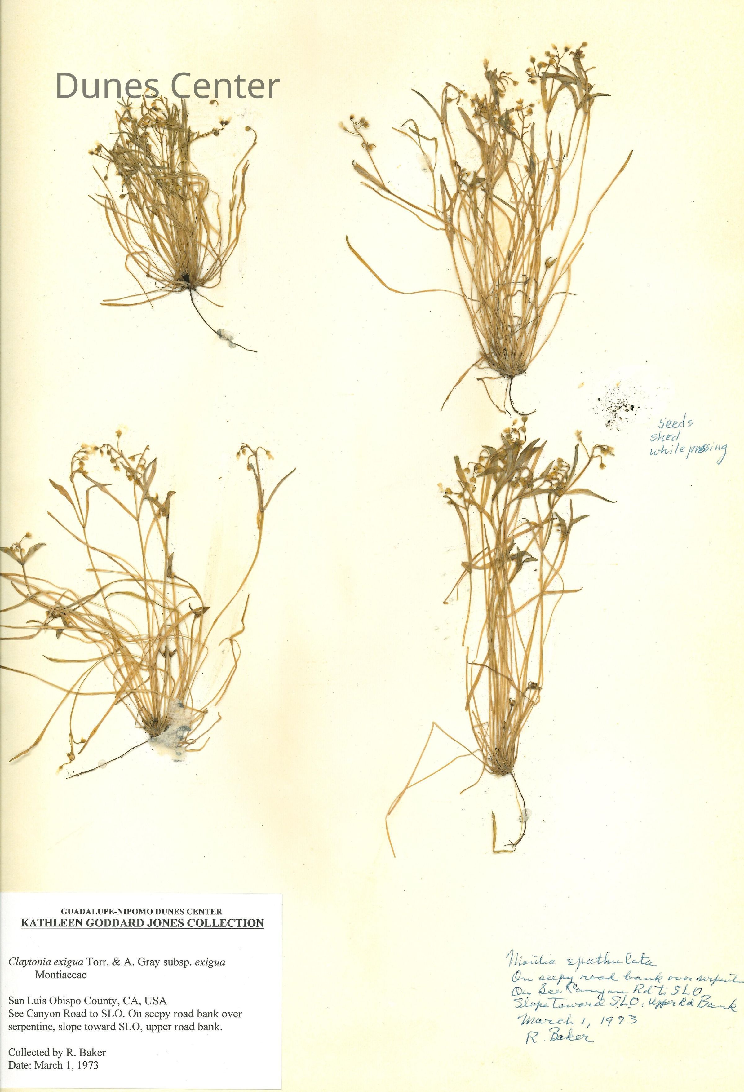 Common Name: Little Spring Beauty, Serpentine Springbeauty Scientific Name: Claytonia exigua Torr. & A. Gray ssp. exigua Family: Montiaceae San Luis Obispo County, CA, USA See Canyon Road to SLO. On seepy road bank over serpentine, slope toward SLO, upper road bank. Collected by R. Baker Date: March 1, 1973Collection