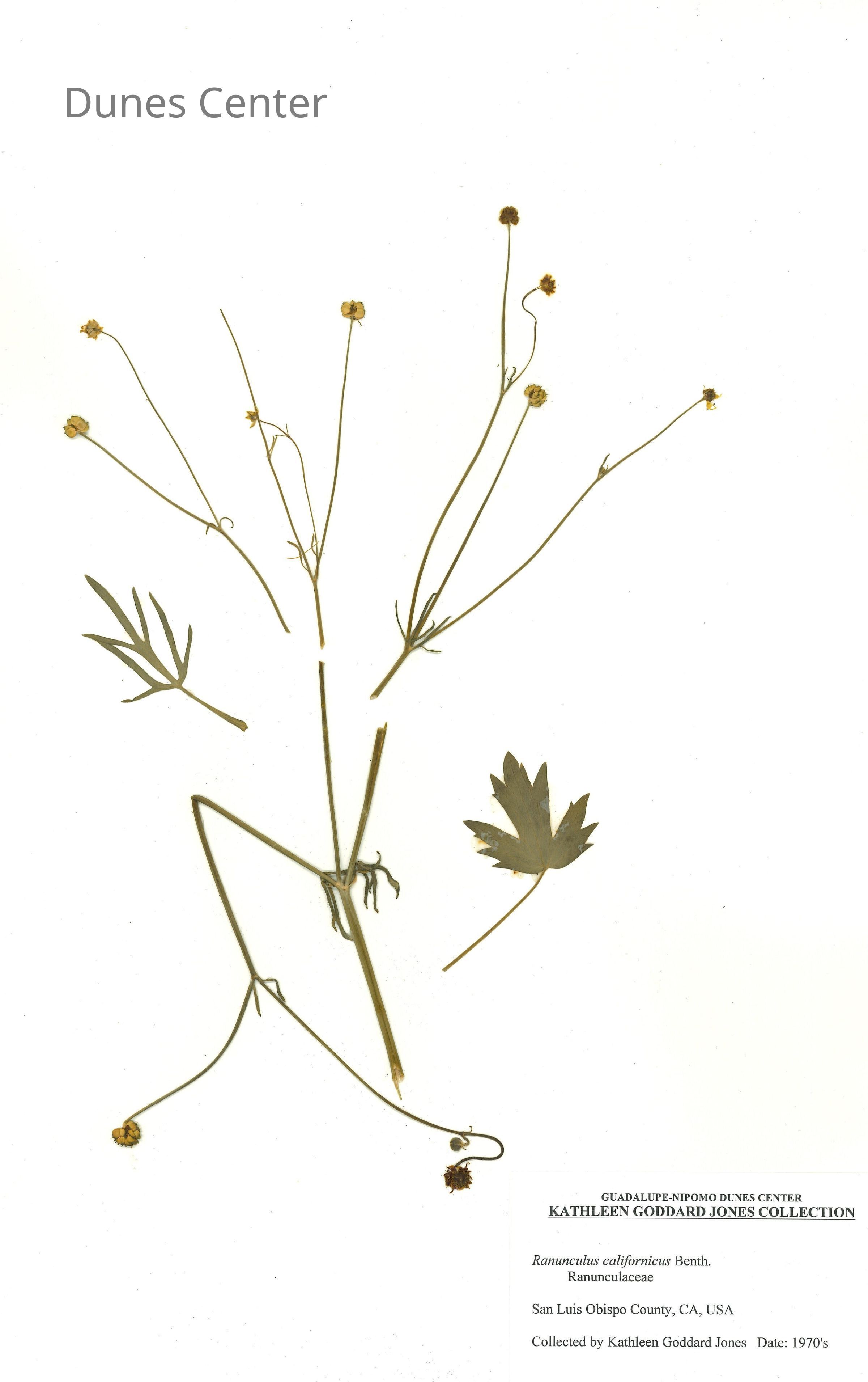 Common Name: California Buttercup Scientific Name: Ranunculus californicus Benth. Family: Ranunculaceae San Luis Obispo County, CA, USA Collected by Kathleen Goddard Jones Date: 1970'sCollection