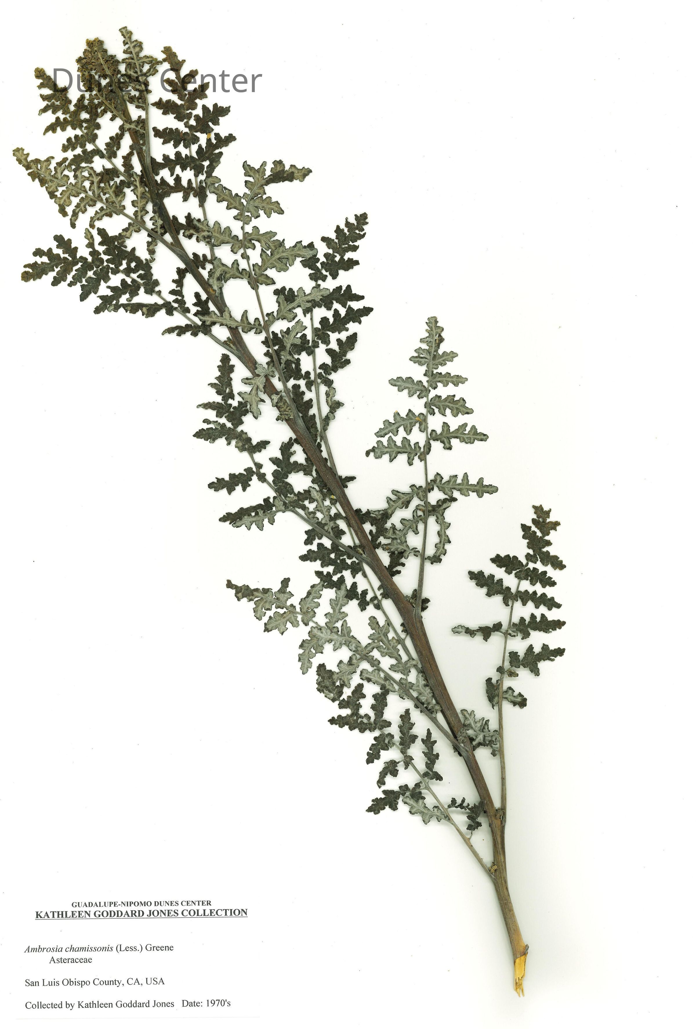Common Names: Beach Bur, Silver Beachweed Scientific Name: Ambrosia chamissonis (Less.) Greene Family: Asteraceae San Luis Obispo County, CA, USA Collected by Kathleen Goddard Jones Date: 1970'sCollection