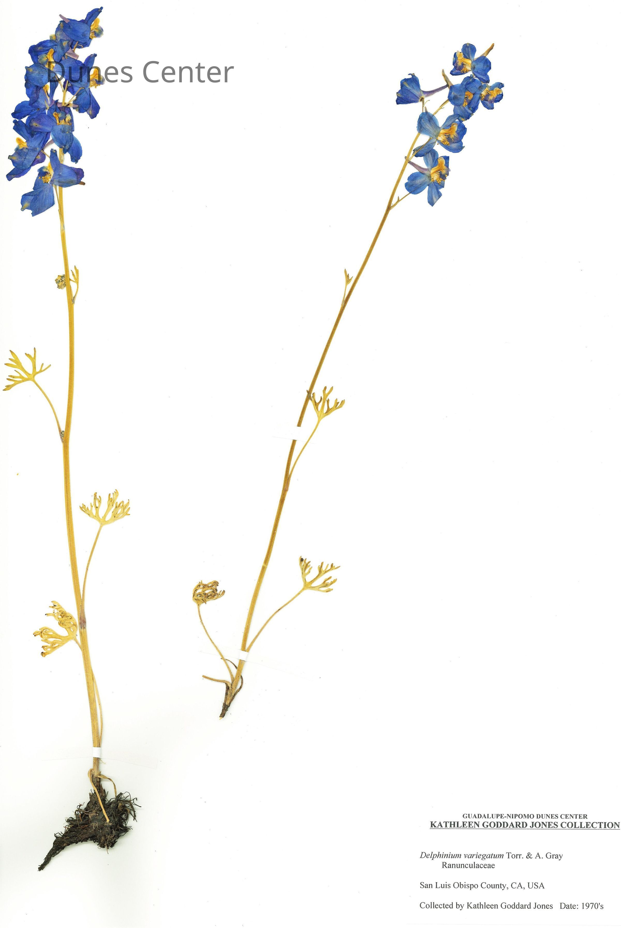 Common Name: Royal Larkspur Scientific Name: Delphinium variegatum Torr. & A. Gray Family: Ranunculaceae San Luis Obispo County, CA, USA Collected by Kathleen Goddard Jones Date: 1970'sCollection
