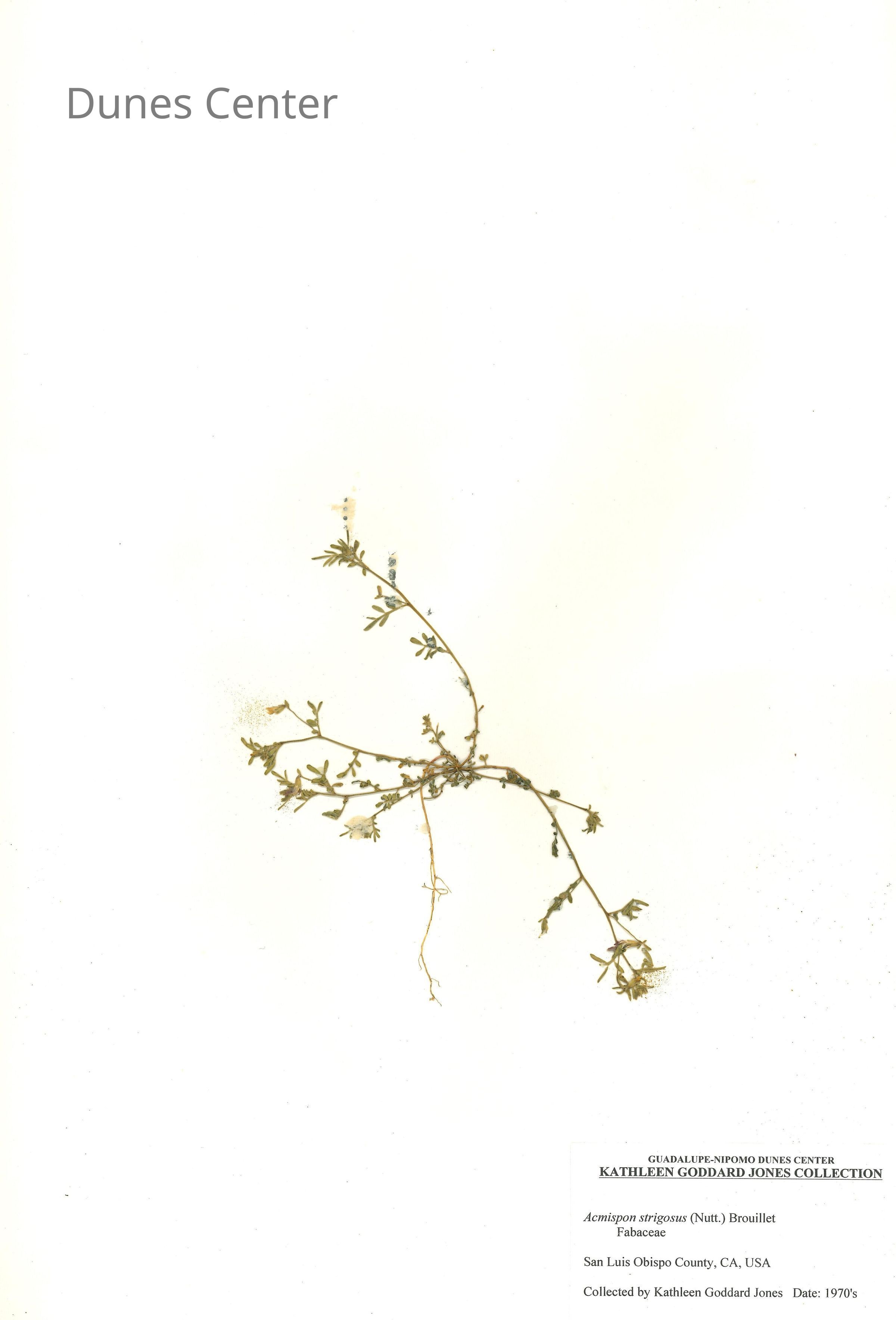 Common Names: Stiff-haired Lotus, Strigose Bird's-foot Trefoil Scientific Name: Acmispon strigosus (Nutt.) Brouillet Family: Fabaceae San Luis Obispo County, CA, USA Collected by Kathleen Goddard Jones Date: 1970'sCollection