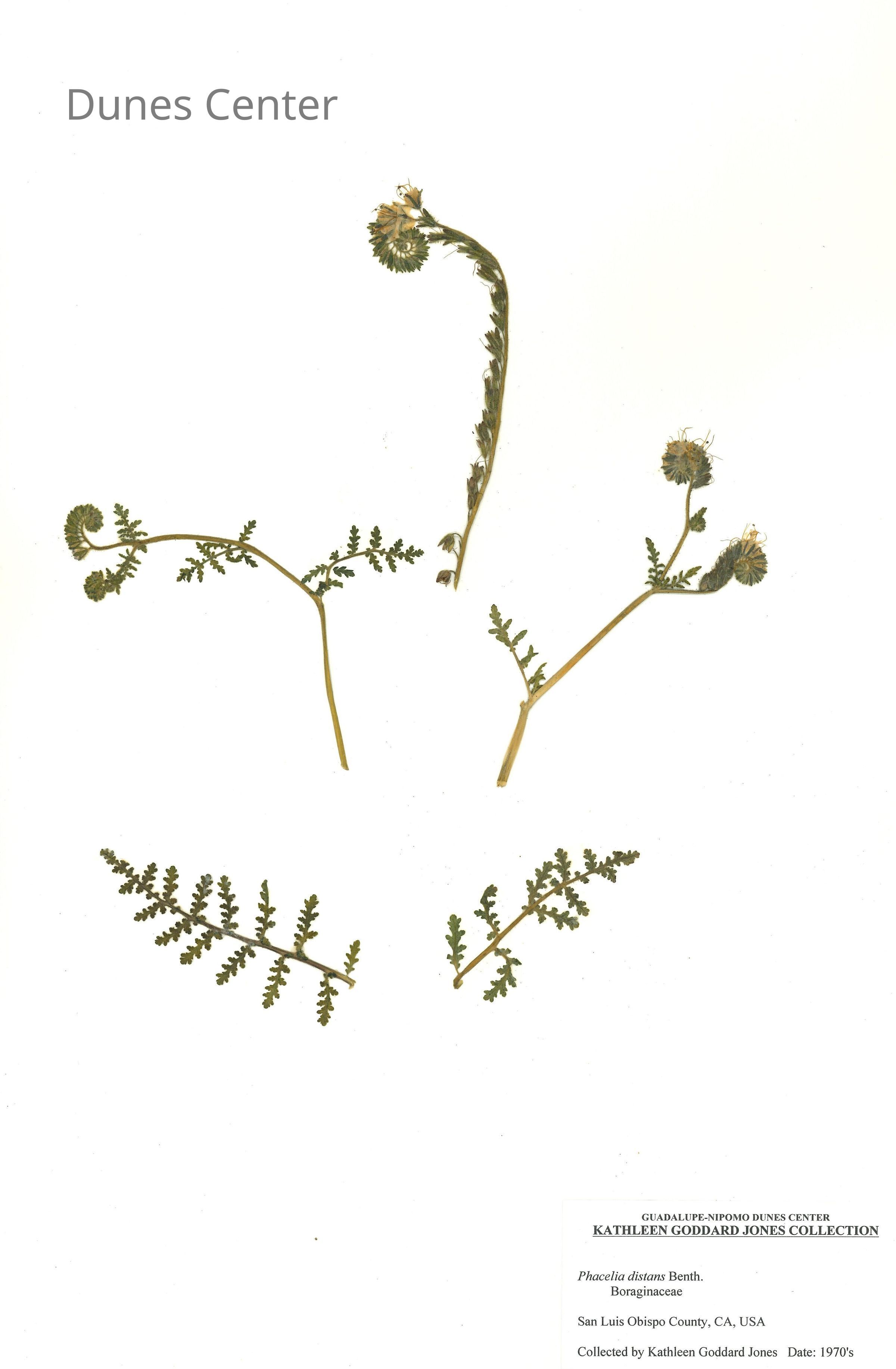 Common Names: Common Phacelia, Distant Phacelia, Wild Heliotrope Scientific Name: Phacelia distans Benth. Family: Boraginaceae San Luis Obispo County, CA, USA Collected by Kathleen Goddard Jones Date: 1970'sCollection