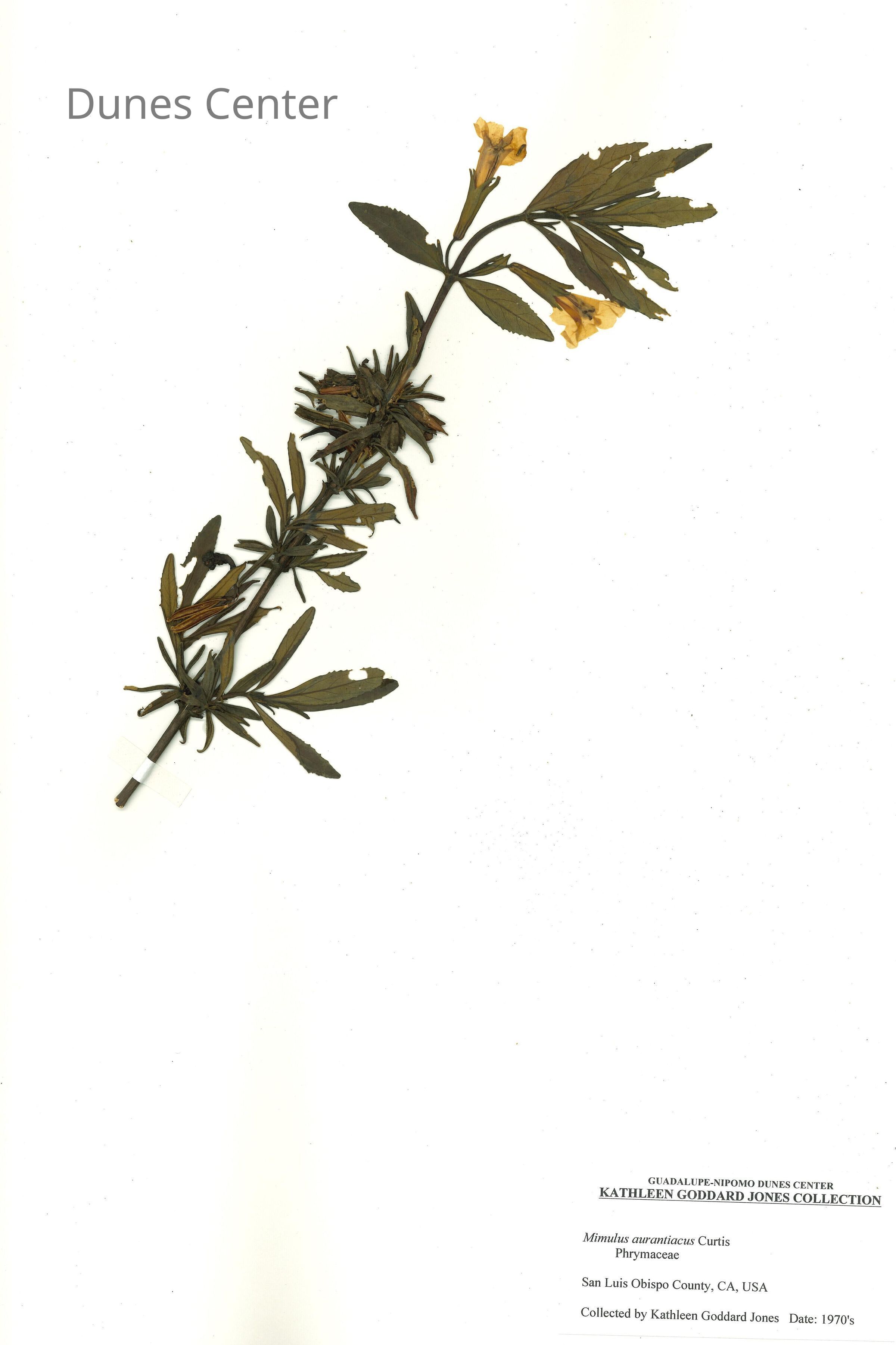 Common Name: Sticky Monkeyflower Scientific Name: Diplacus aurantiacus Curtis, formerly Mimulus aurantiacus Curtis Family: Phrymaceae San Luis Obispo County, CA, USA Collected by Kathleen Goddard Jones Date: 1970'sEntry/Object ID