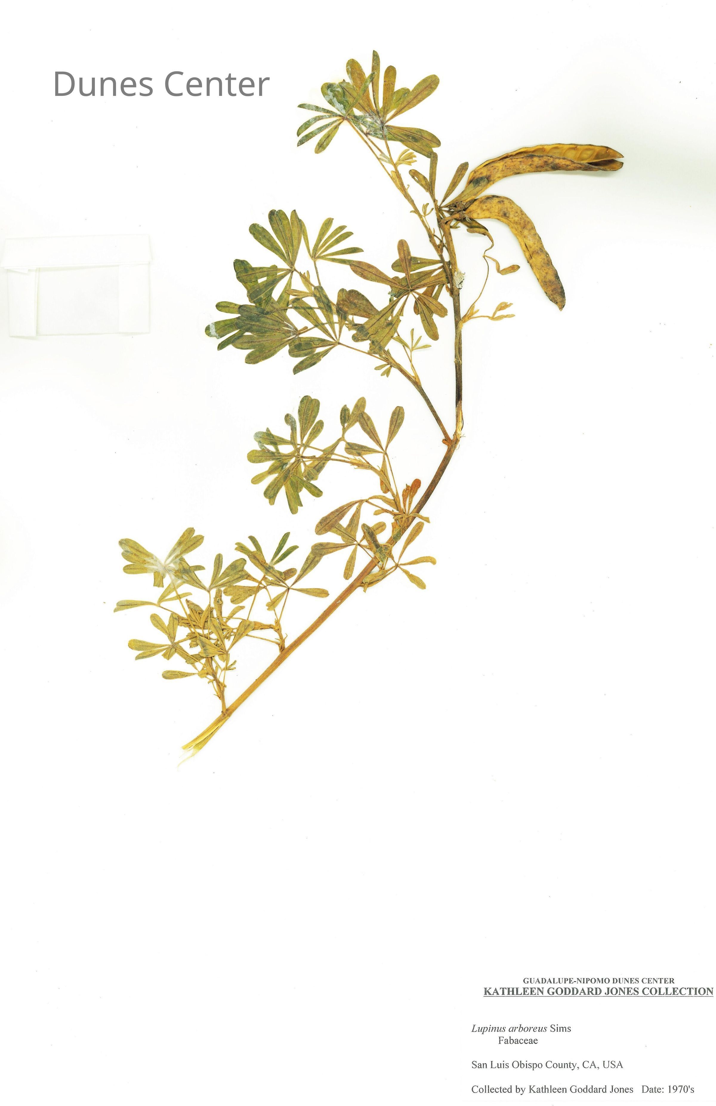 Common Names: Coastal Bush Lupine, Yellow Bush Lupine Scientific Name: Lupinus arboreus Sims Family: Fabaceae San Luis Obispo County, CA, USA Collected by Kathleen Goddard Jones Date: 1970'sEntry/Object ID