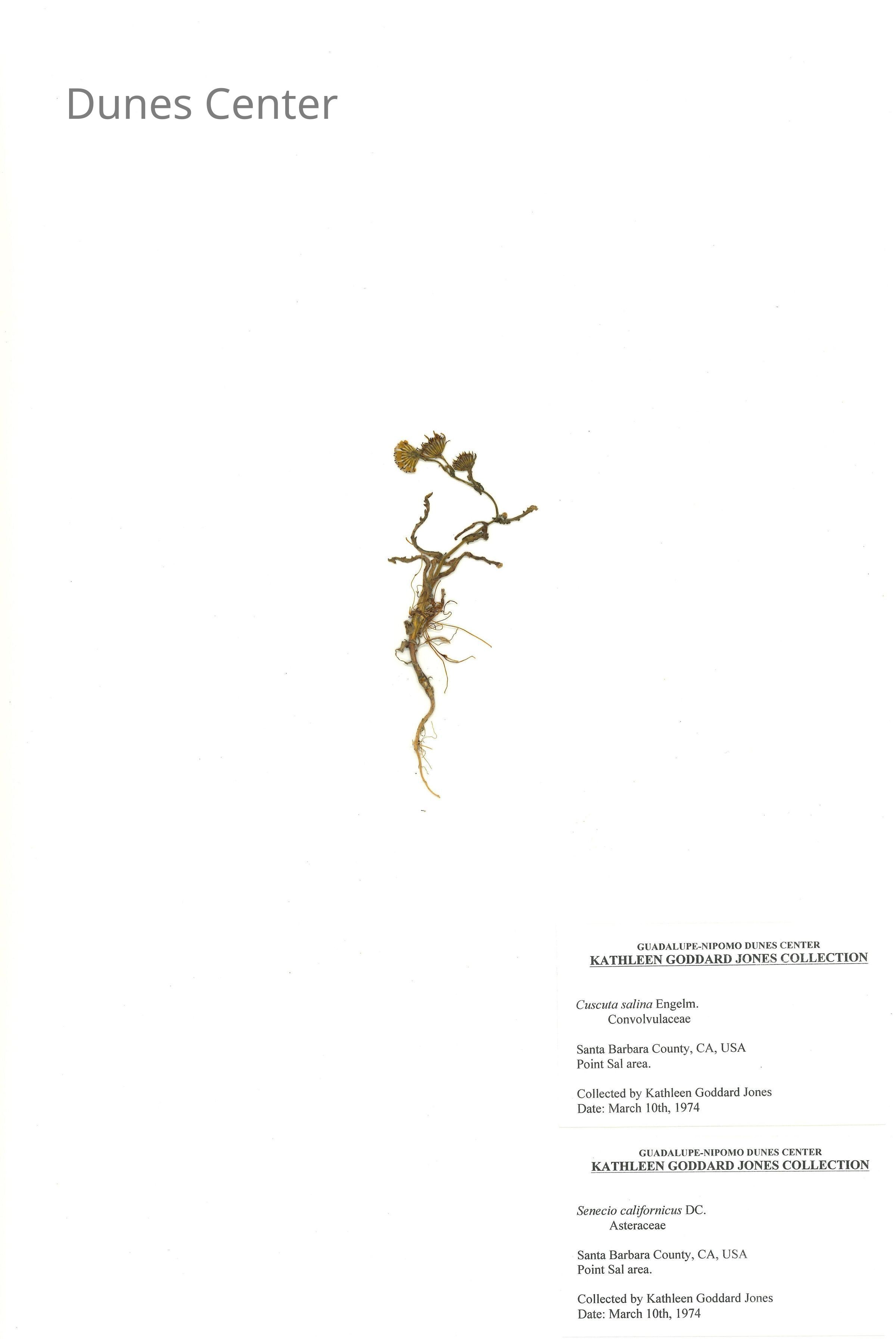 Common Names: California Butterweed, California Groundsel, California Ragwort Scientific Name: Senecio californicus DC. Family: Asteraceae Santa Barbara County, CA, USA Point Sal area. Collected by Kathleen Goddard Jones Date: March 10th, 1974Collection