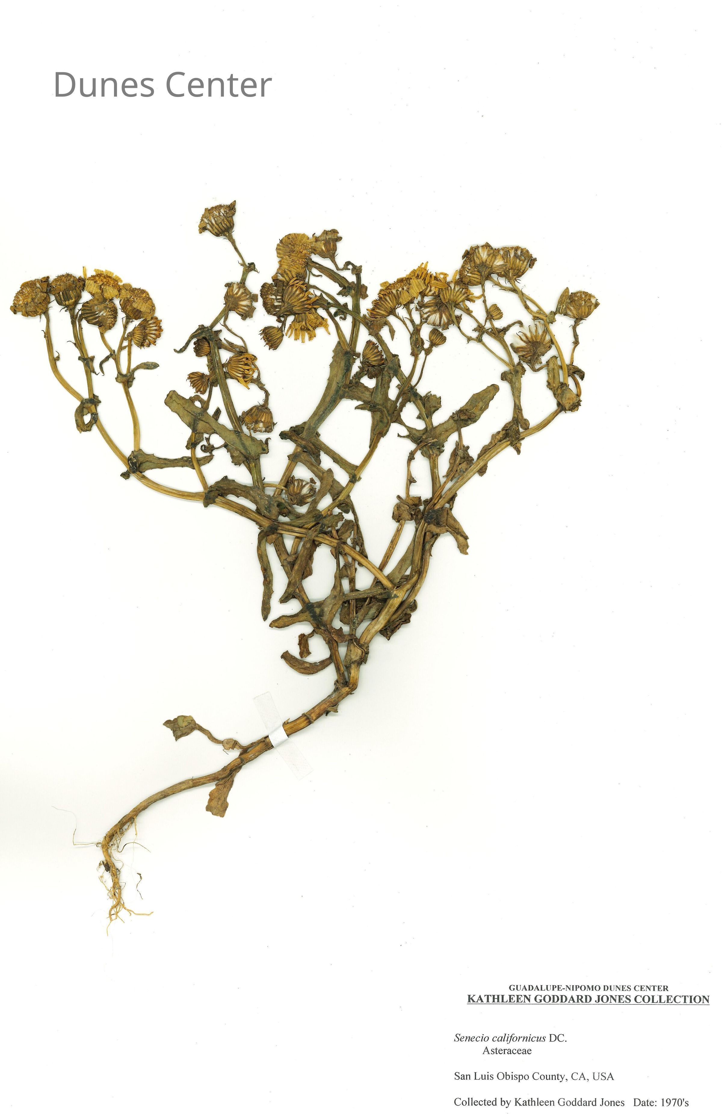 Common Names: California Butterweed, California Groundsel, California Ragwort Scientific Name: Senecio californicus DC. Family: Asteraceae San Luis Obispo County, CA, USA Collected by Kathleen Goddard Jones Date: 1970'sCollection