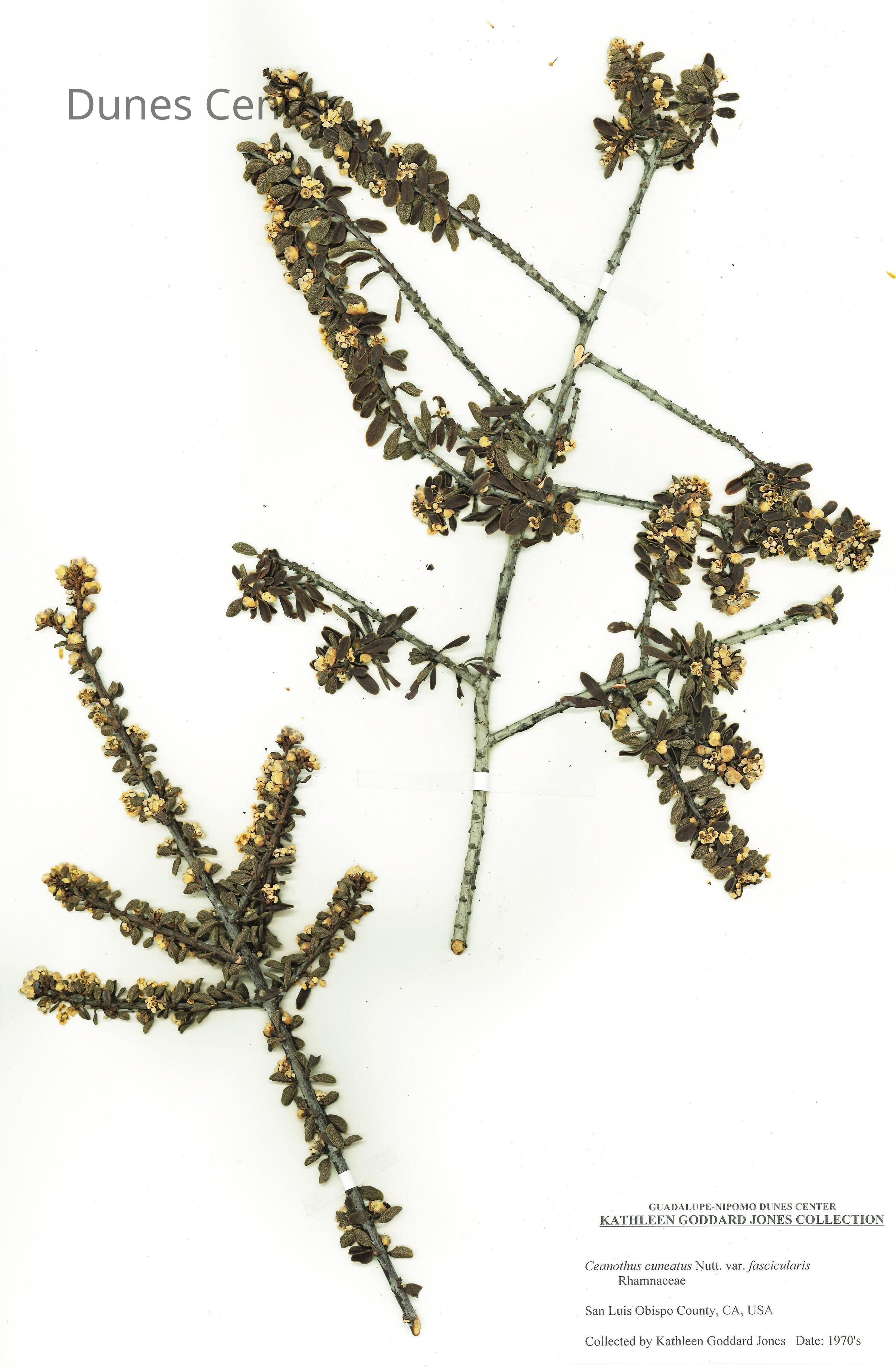 Common Names: Sand Buck Brush, Sedgeleaf Buckbrush Scientific Name: Ceanothus cuneatus (Hook.) Nutt. var. fascicularis (McMinn) Hoover Family: Rhamnaceae San Luis Obispo County, CA, USA Collected by Kathleen Goddard Jones Date: 1970'sCollection