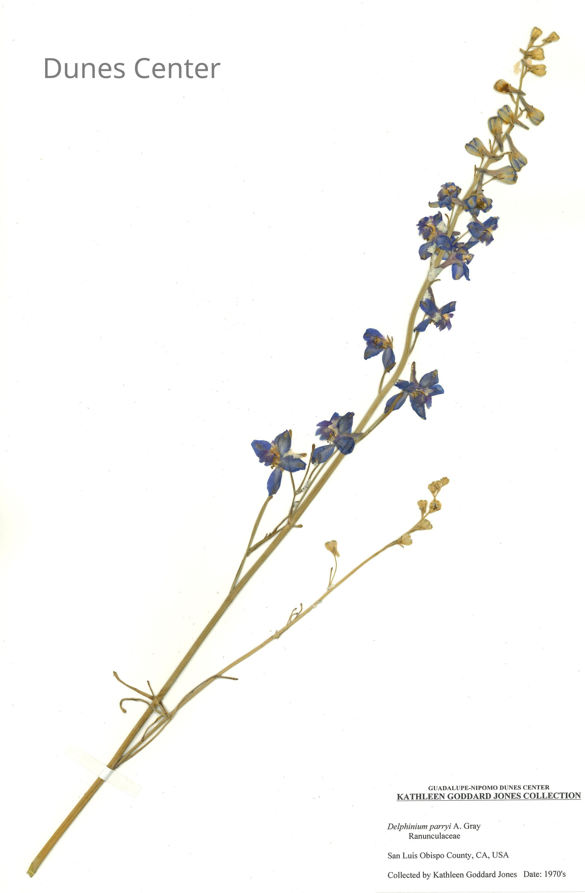 Common Name: San Bernardino Larkspur Scientific Name: Delphinium parryi A. Gray Family: Ranunculaceae San Luis Obispo County, CA, USA Collected by Kathleen Goddard Jones Date: 1970'sCollection