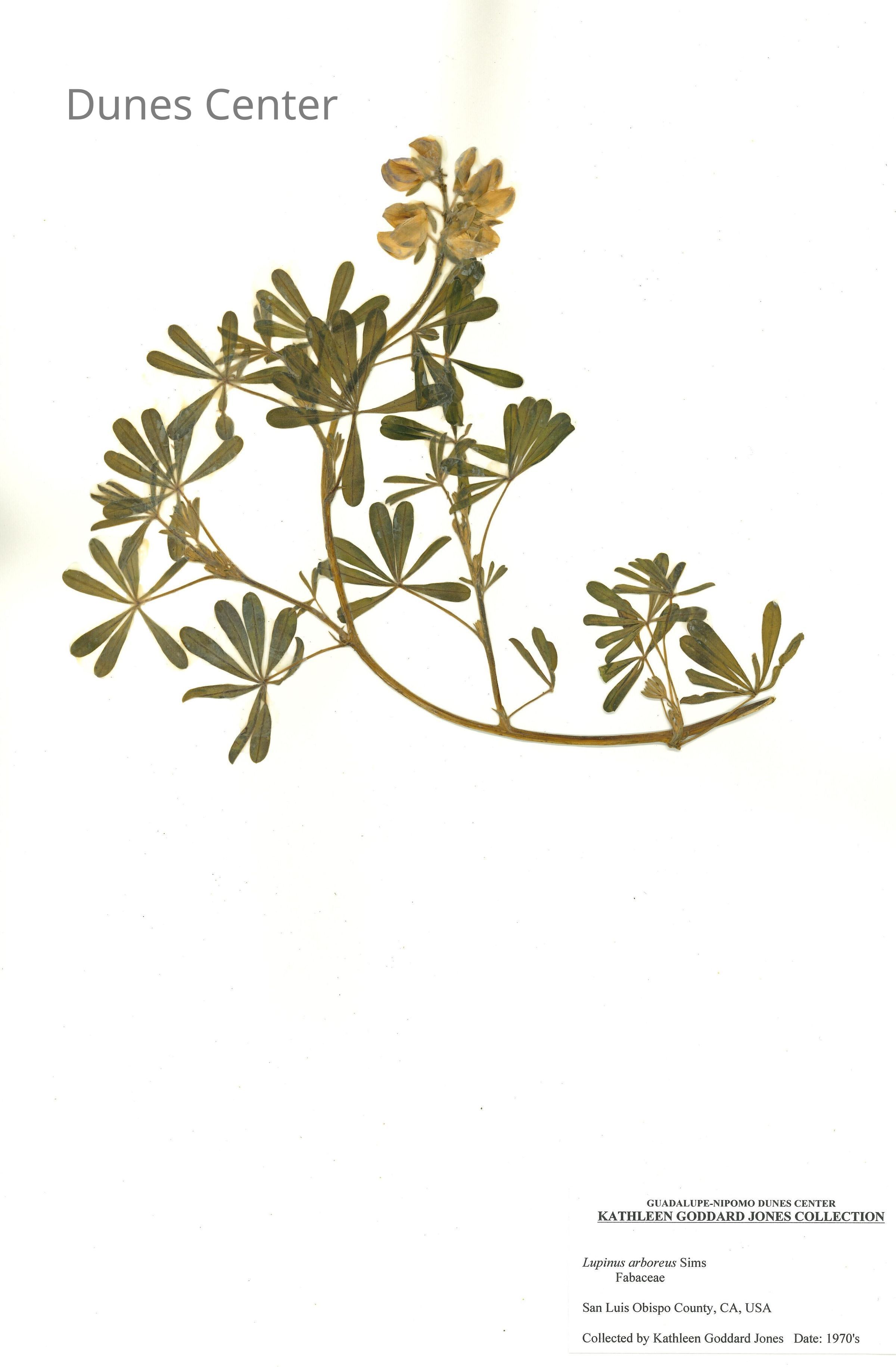 Common Names: Coastal Bush Lupine, Yellow Bush Lupine Scientific Name: Lupinus arboreus Sims Family: Fabaceae San Luis Obispo County, CA, USA Collected by Kathleen Goddard Jones Date: 1970'sEntry/Object ID