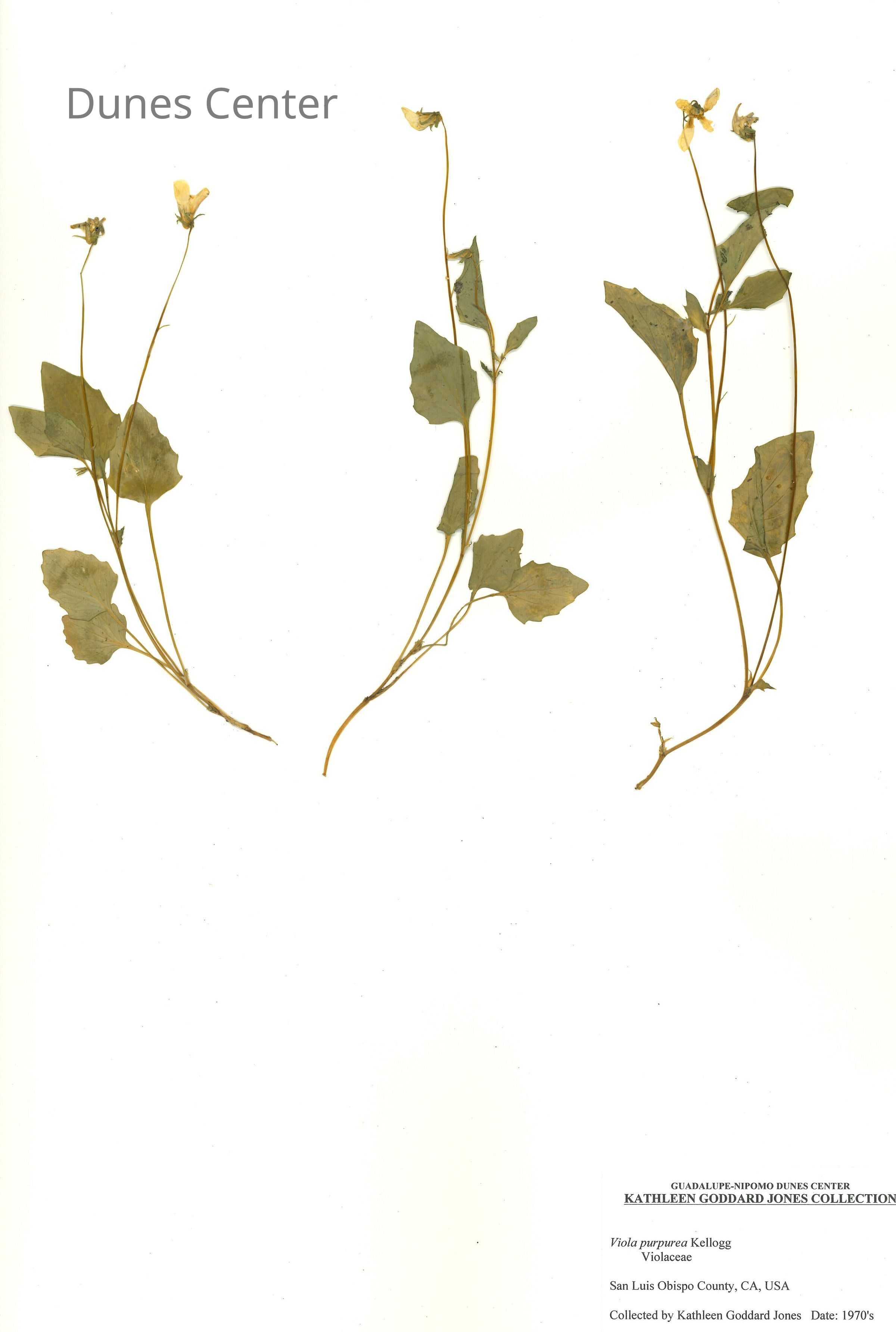 Common Names: Goosefoot Violet, Mountain Violet Scientific Name: Viola purpurea Kellogg Family: Violaceae San Luis Obispo County, CA, USA Collected by Kathleen Goddard Jones Date: 1970'sEntry/Object ID