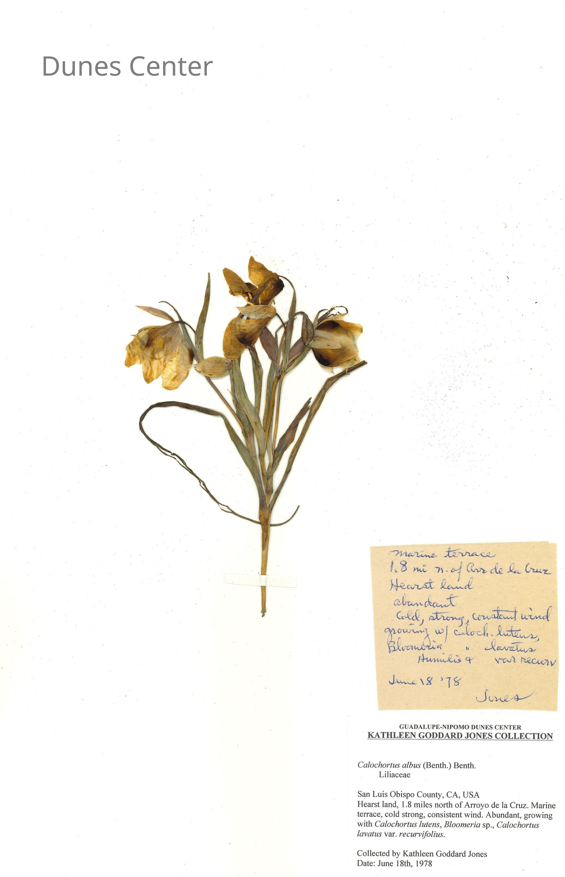 Common Names: White Fairy Lantern, White Globe Lily Scientific Name: Calochortus albus (Benth.) Douglas ex Benth. Family: Liliaceae San Luis Obispo County, CA, USA Hearst land, 1.8 miles north of Arroyo de la Cruz. Marine terrace, cold strong, consistent wind. Abundant, growing with Calochortus lutens, Bloomeria sp., Calochortus lavatus var. recurvifolius Collected by Kathleen Goddard Jones Date: June 18th, 1978Collection