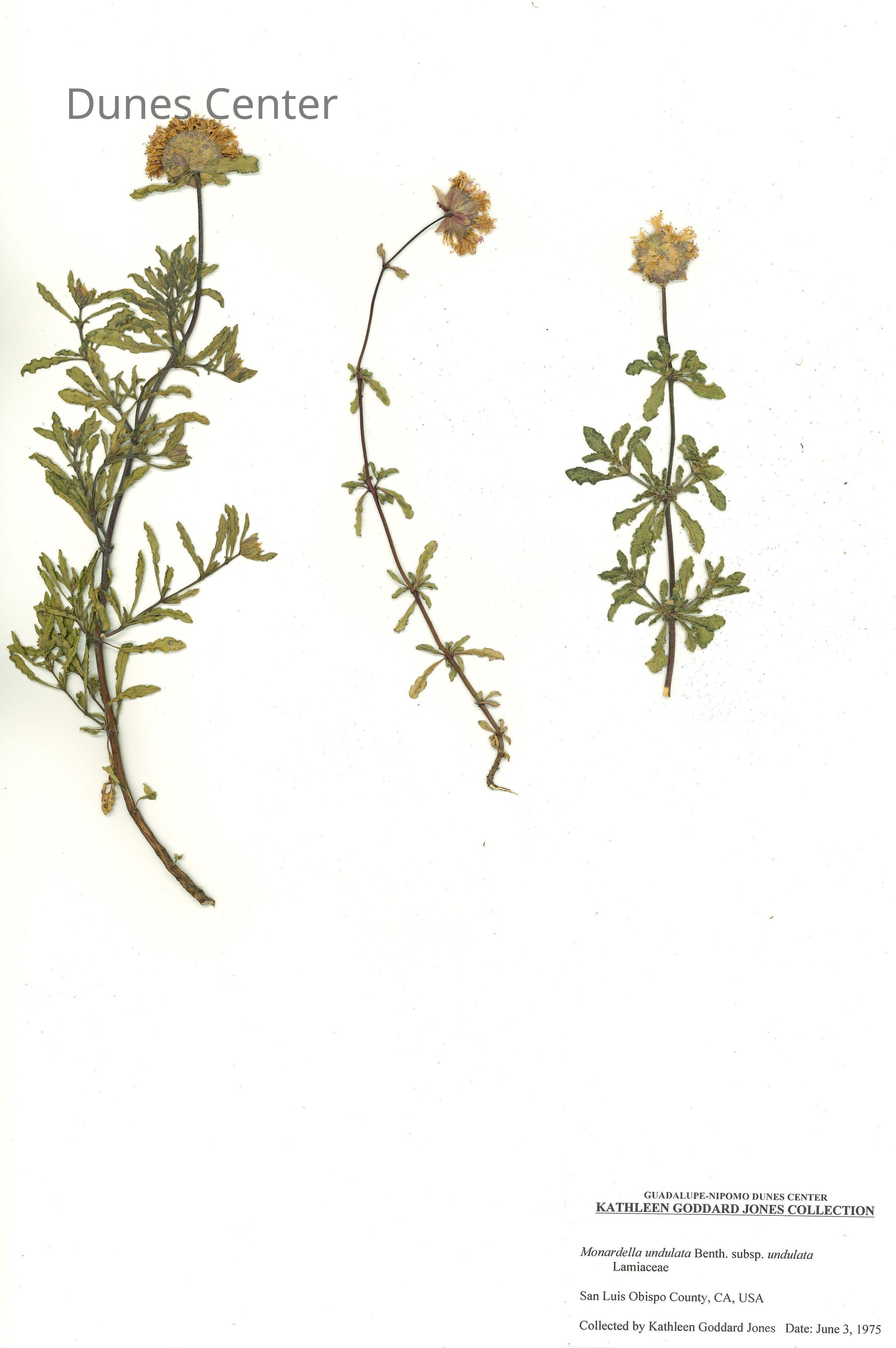 Common Name: San Luis Obispo Monardella Scientific Name: Monardella undulata Benth. ssp. undulata Family: Lamiaceae San Luis Obispo County, CA, USA Collected by Kathleen Goddard Jones Date: June 3, 1975Collection