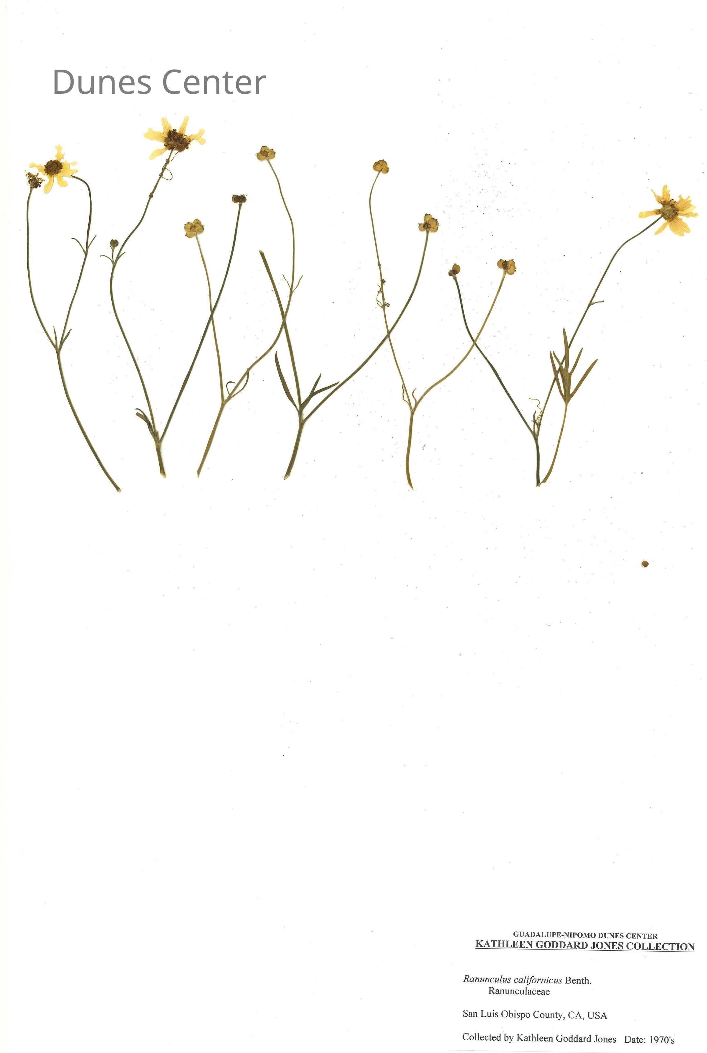 Common Name: California Buttercup Scientific Name: Ranunculus californicus Benth. Family: Ranunculaceae San Luis Obispo County, CA, USA Collected by Kathleen Goddard Jones Date: 1970'sCollection