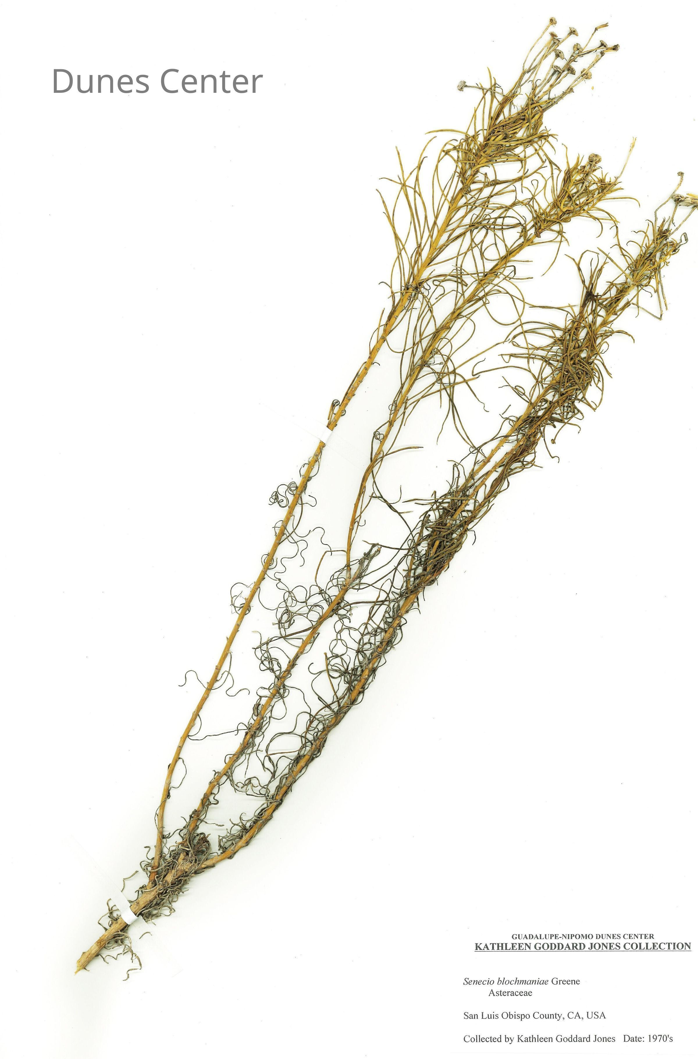 Common Name: Dune Ragwort Scientific Name: Senecio blochmaniae Greene Family: Asteraceae San Luis Obispo County, CA, USA Collected by Kathleen Goddard Jones Date: 1970'sCollection