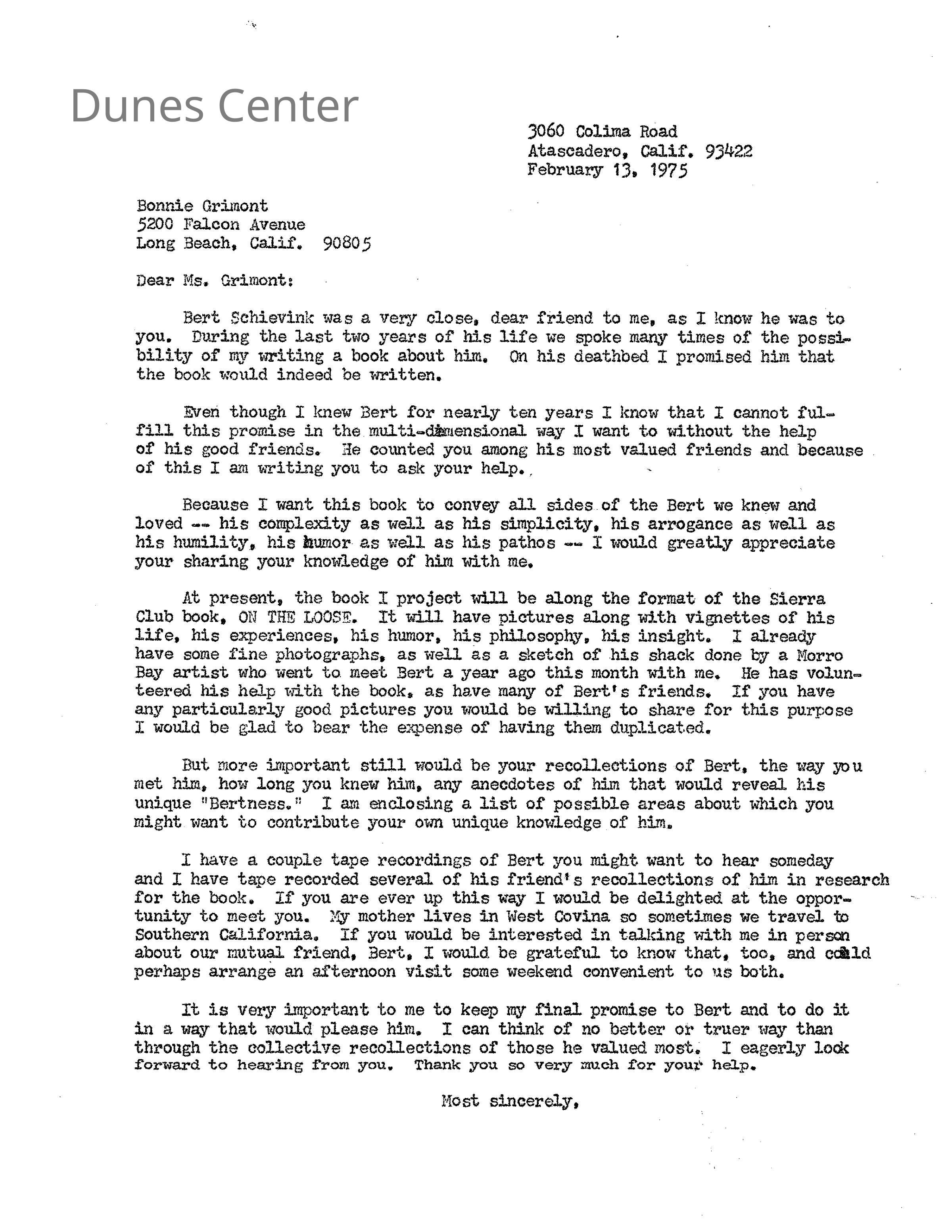 Letter to Bonnie Grimont asking for information about Bert Schievink