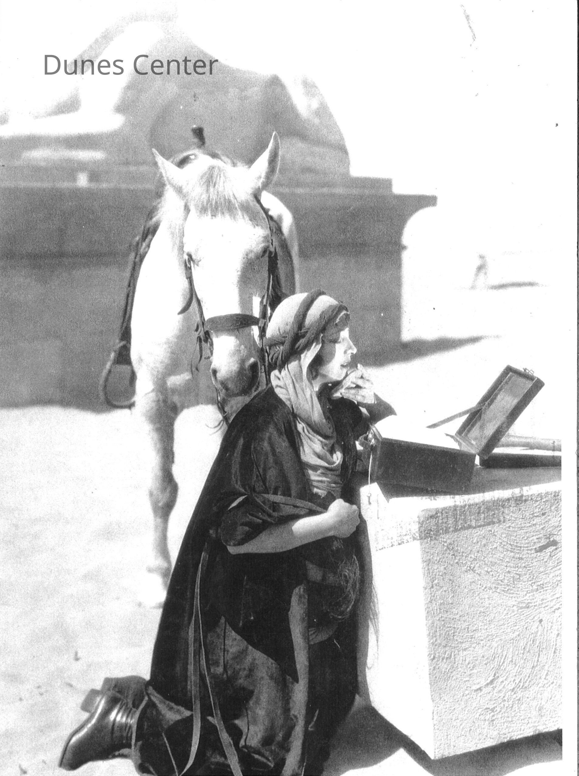 Mirium played by Estelle Taylor fixing makeup in small mirror. White horse stands in the background.
