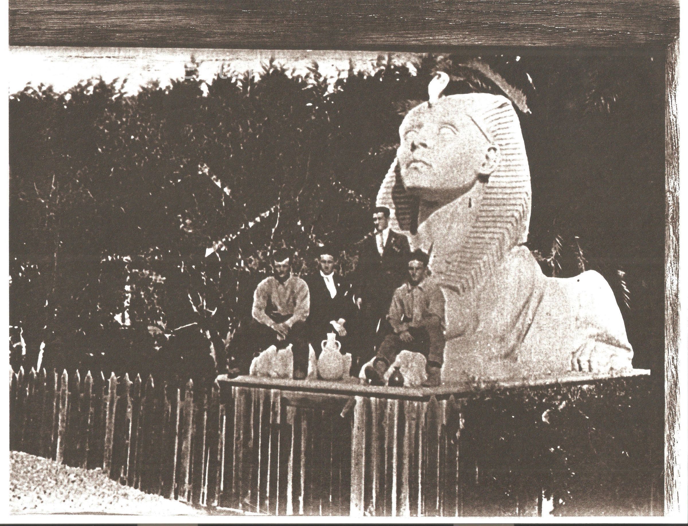 4 men pose in front of sphinx taken from set of The Ten Commandments.