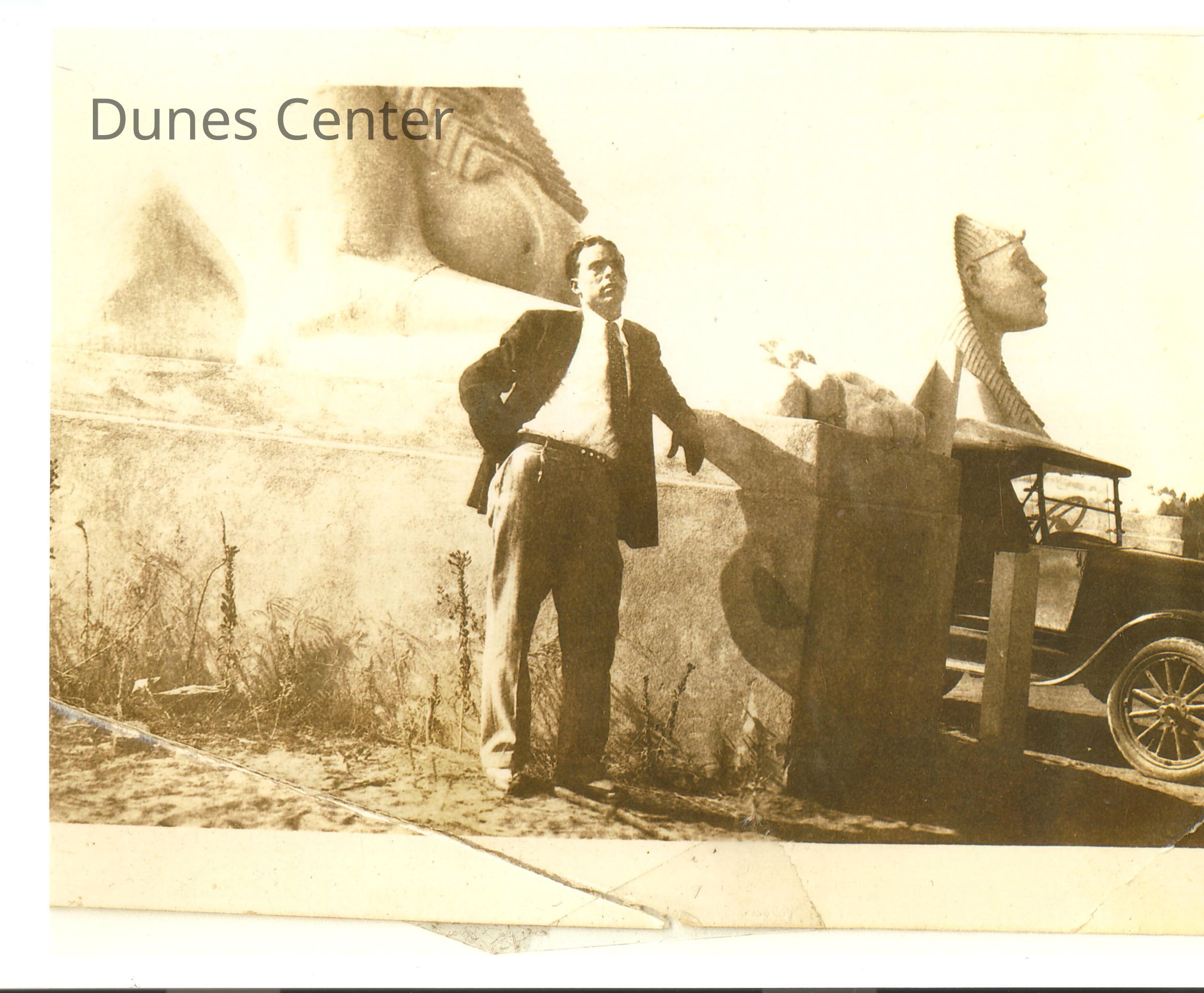 Man poses in front of 2 sphinx taken from the set of The Ten Commandments with old car in the background.