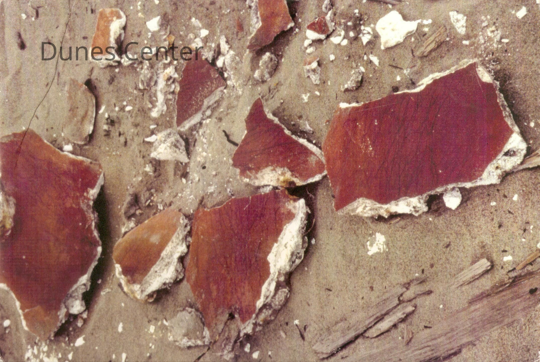 1997 Ten Commandments excavation. Large plaster pieces with redish paint coat on one side.