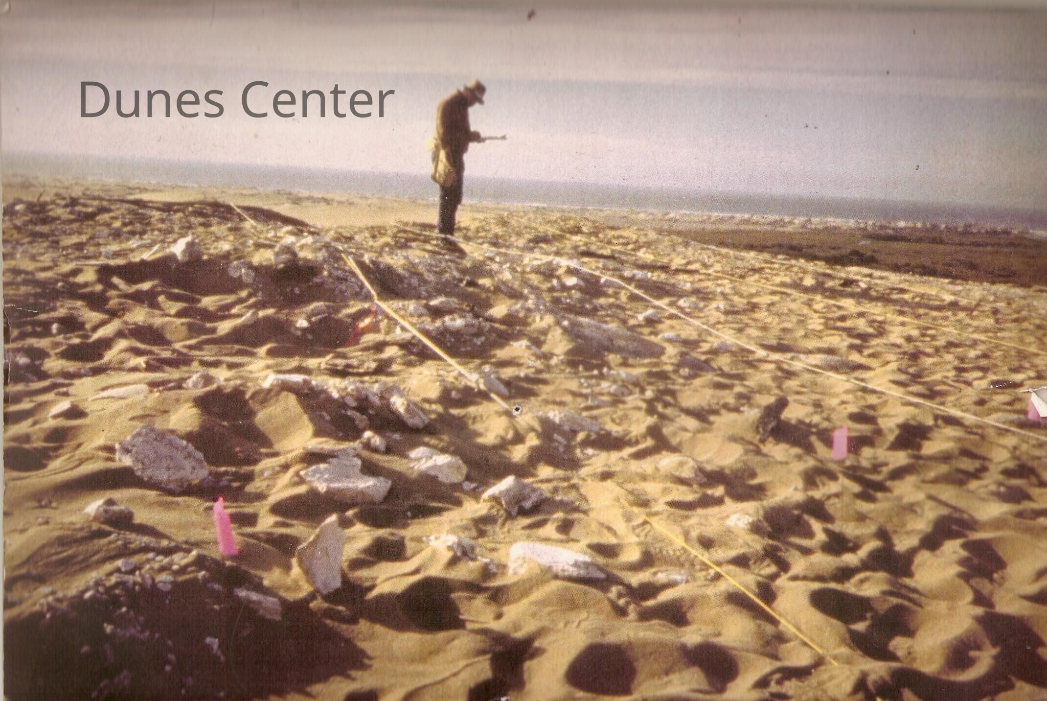 1997 Ten Commandments excavation. Site of first dig roped off with man surveying the area.