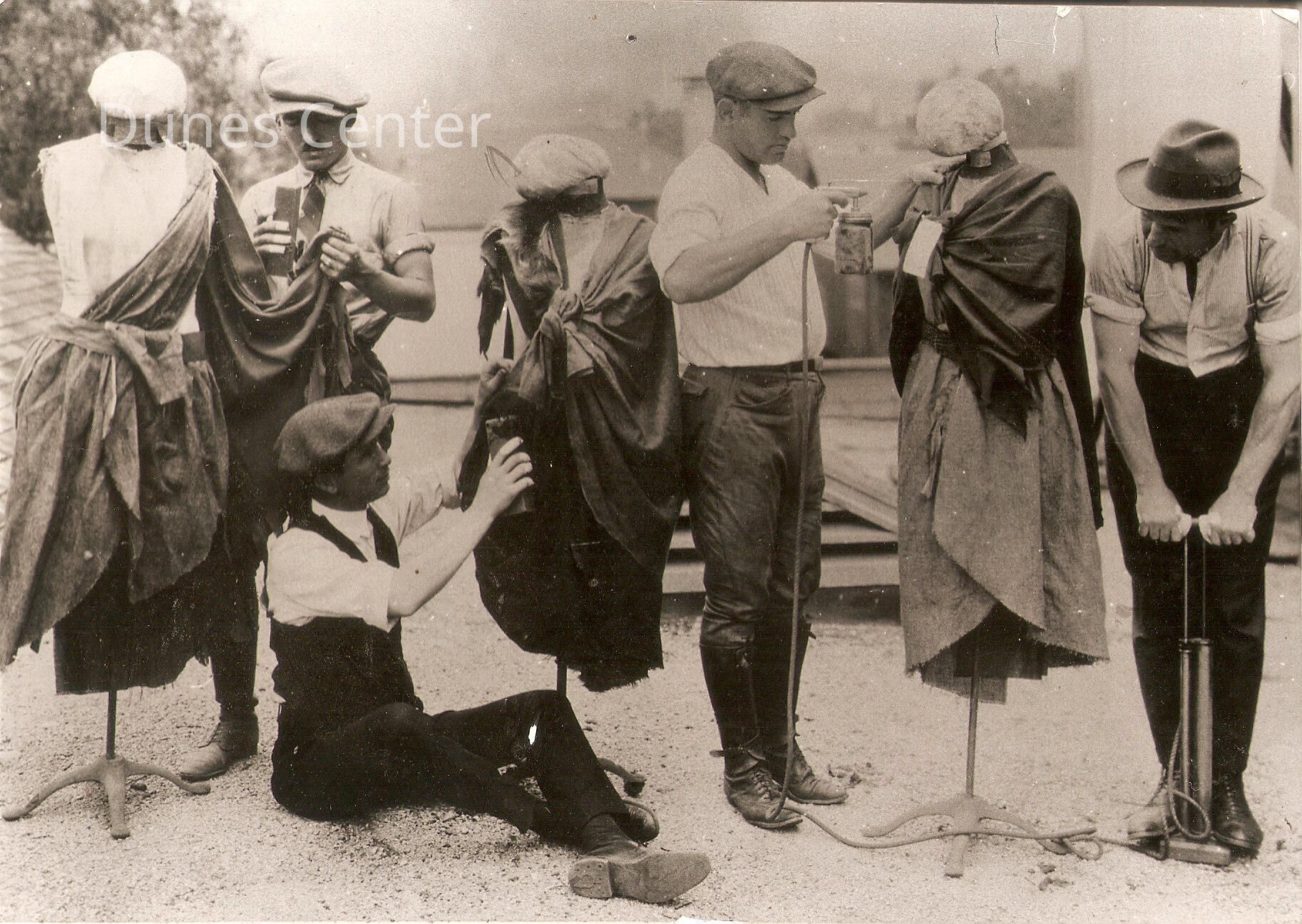1923 behind the scenes. Costumers touching up costumes on mannequins.