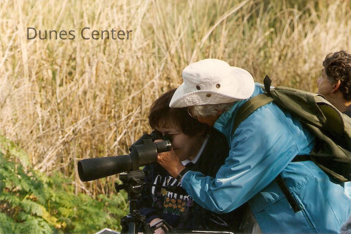 Walk for physically disabled 1994. Betty Usher helps a participant with binoculars.