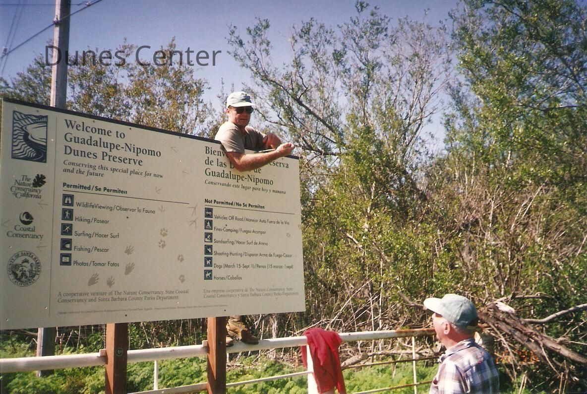 Installation of signs on beaches 3/1996. Pete St. John and Jim Neuschwander at Main St entrance gate.