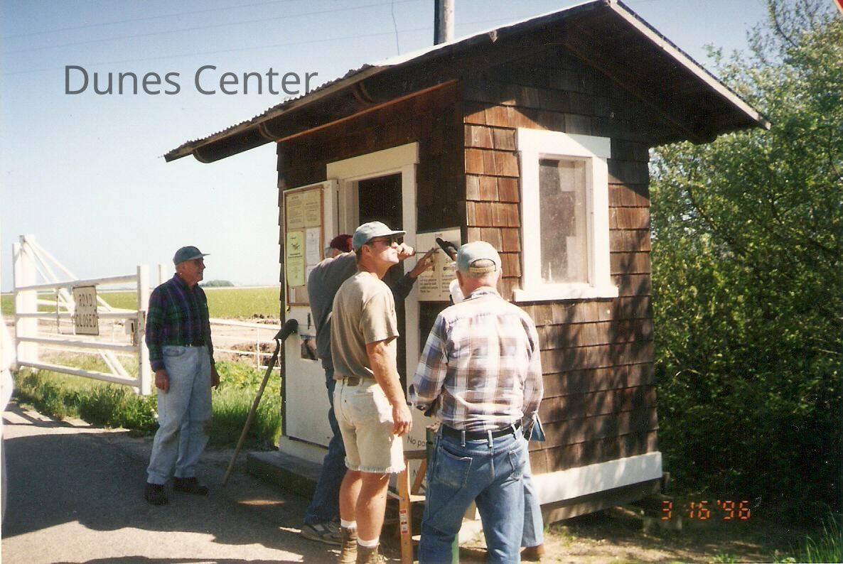 Installation of signs on beaches 3/1996. Dick Williams, Don Wood, Pete St. John, Jim Neuschwander, and Gerda Perez at Main St Gate entrance.