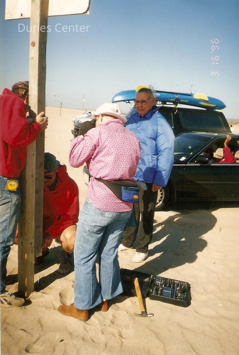Installation of signs on beaches 3/1996. Chuck Warner, Pete St. John, Gerda Perez, and Frank Perez at Guadalupe Beach.
