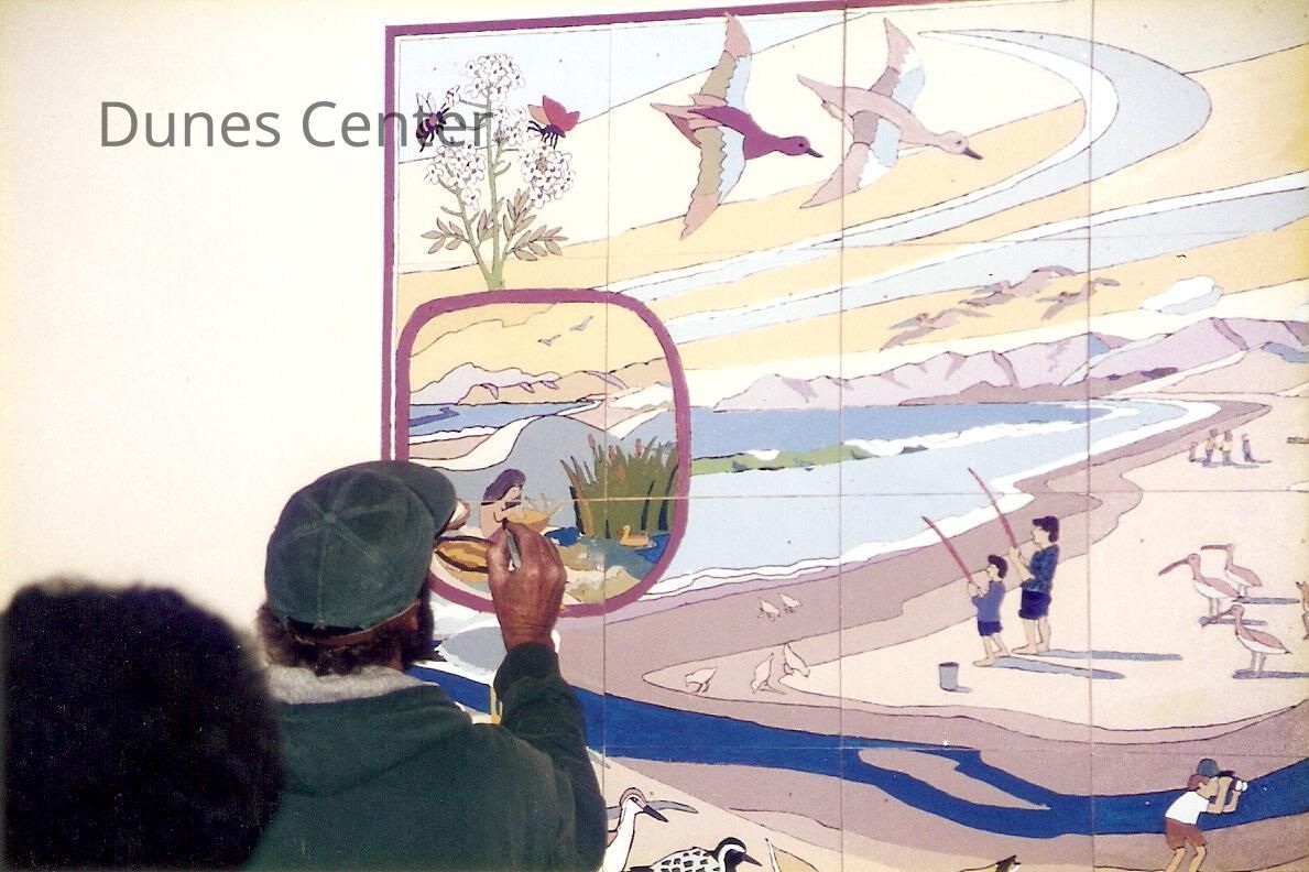 Dunes Discovery Center mural 11/96. Artists John Lwerks puts finishing touches on mural.