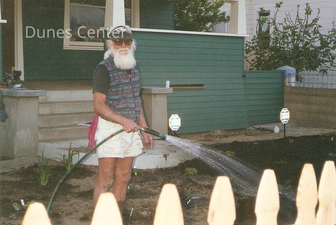 Dunes Discovery Center garden Al Naydol's plant class landscaping front yard 4/01. Bill Deneen with hose.