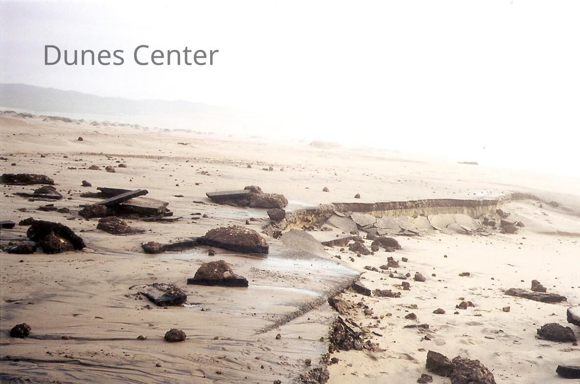 Guadalupe Dunes Preserve aka Rancho Guadalupe Beach County Park. "Guadalupe Beach parking lot broken up by El Nino waves" February 1998