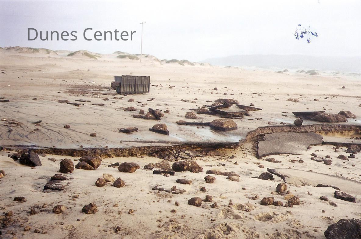Guadalupe Dunes Preserve aka Rancho Guadalupe Beach County Park. "El Nino destruction at Guadalupe Beach parking lot" February 1998