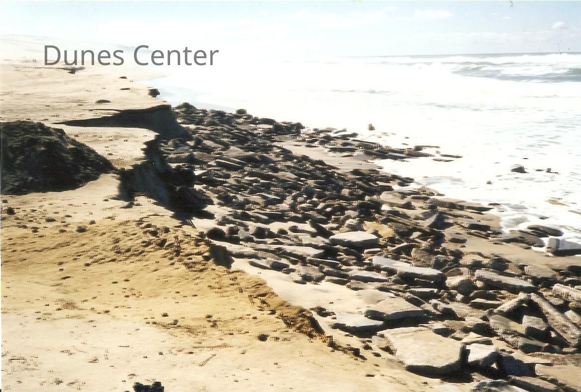 Guadalupe Dunes Preserve aka Rancho Guadalupe Beach County Park. "El Nino destruction of oil company parking area and breakwater north of Guadalupe Beach parking lot" February 1998