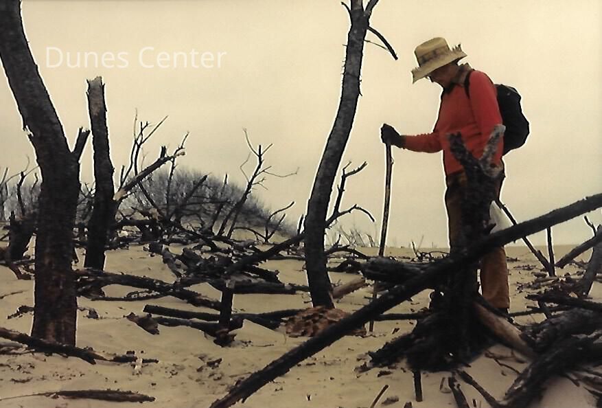 Kathleen Goddard Jones in the Dunes with footprints, photo taken by Liz Scott-Graham, 1987, 8" x 12" color photograph