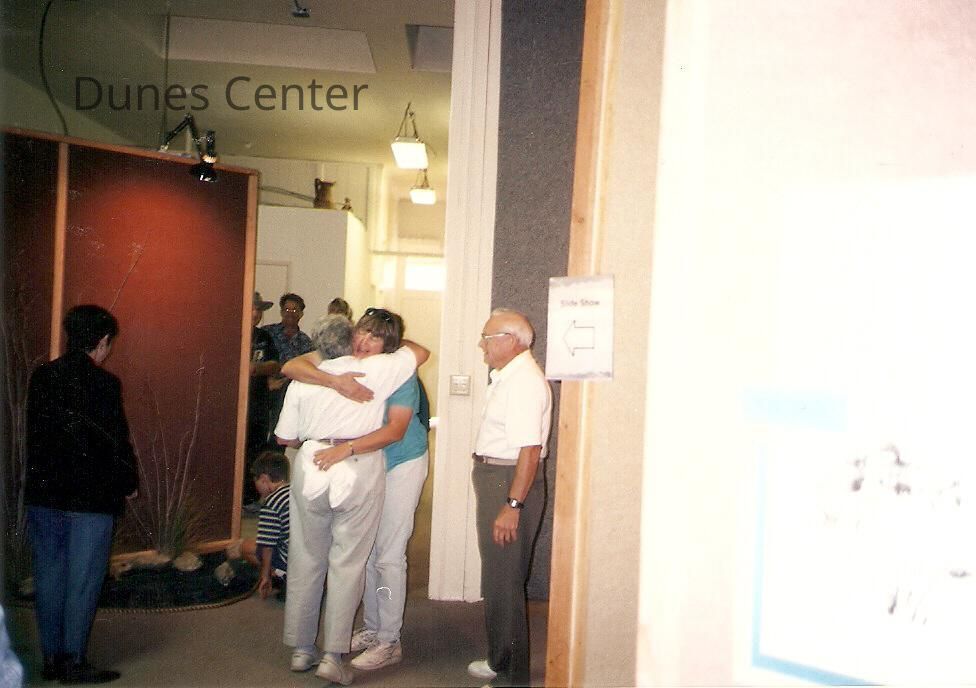 Dunes Discovery Center grand opening 10/13/96. Left to right, Sue McGinty, Hilda Glenesk hugging N.J. Carlile, Ernie Glenesk.