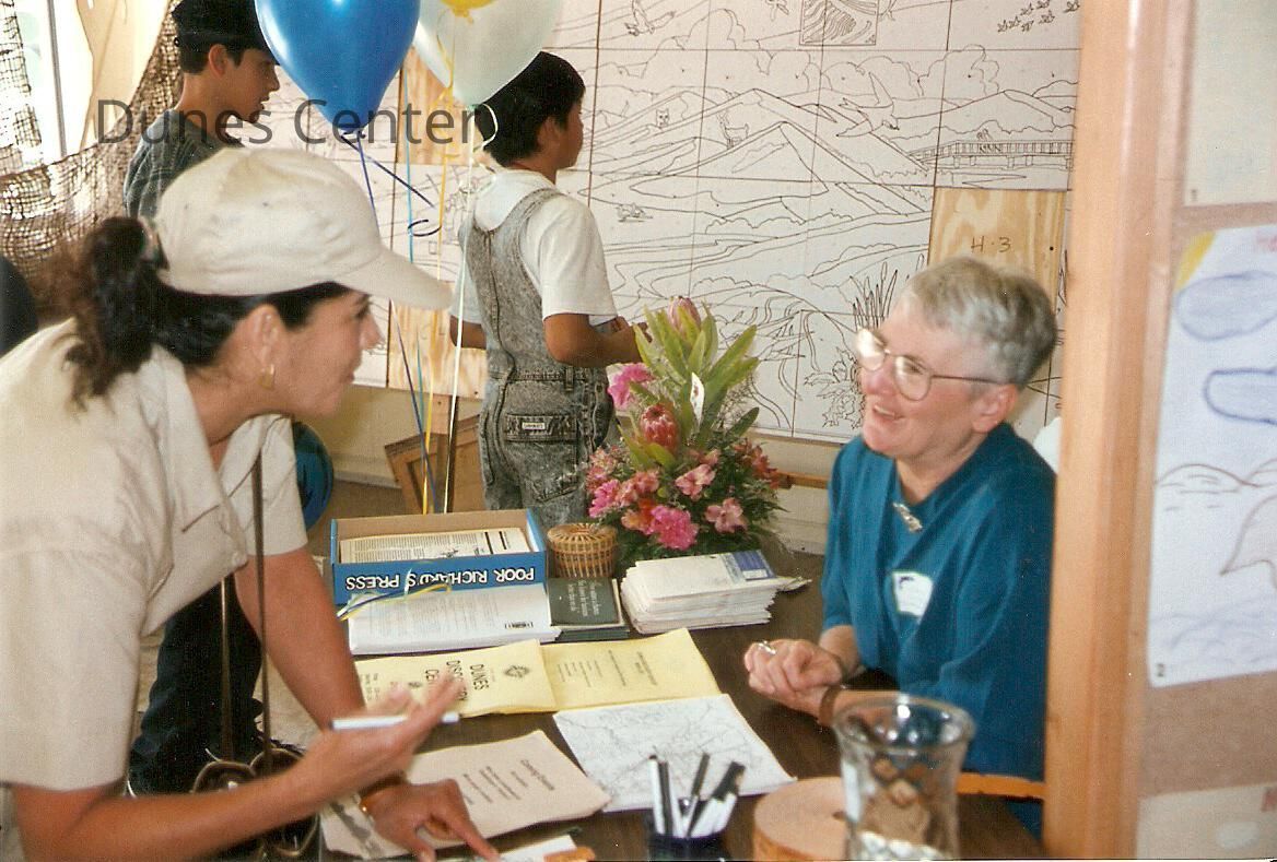 Dunes Discovery Center grand opening 10/13/96. Clara Levesque greets visitors at front desk. Unpainted mural in background.