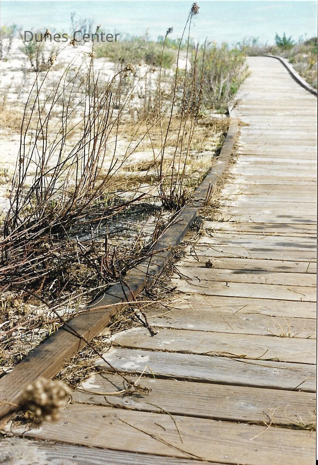 Wooden walkway and landscape of Dunes at Oso Flaco Lake, in photo album - Undated 3.5" x 5" color photographEntry/Object ID