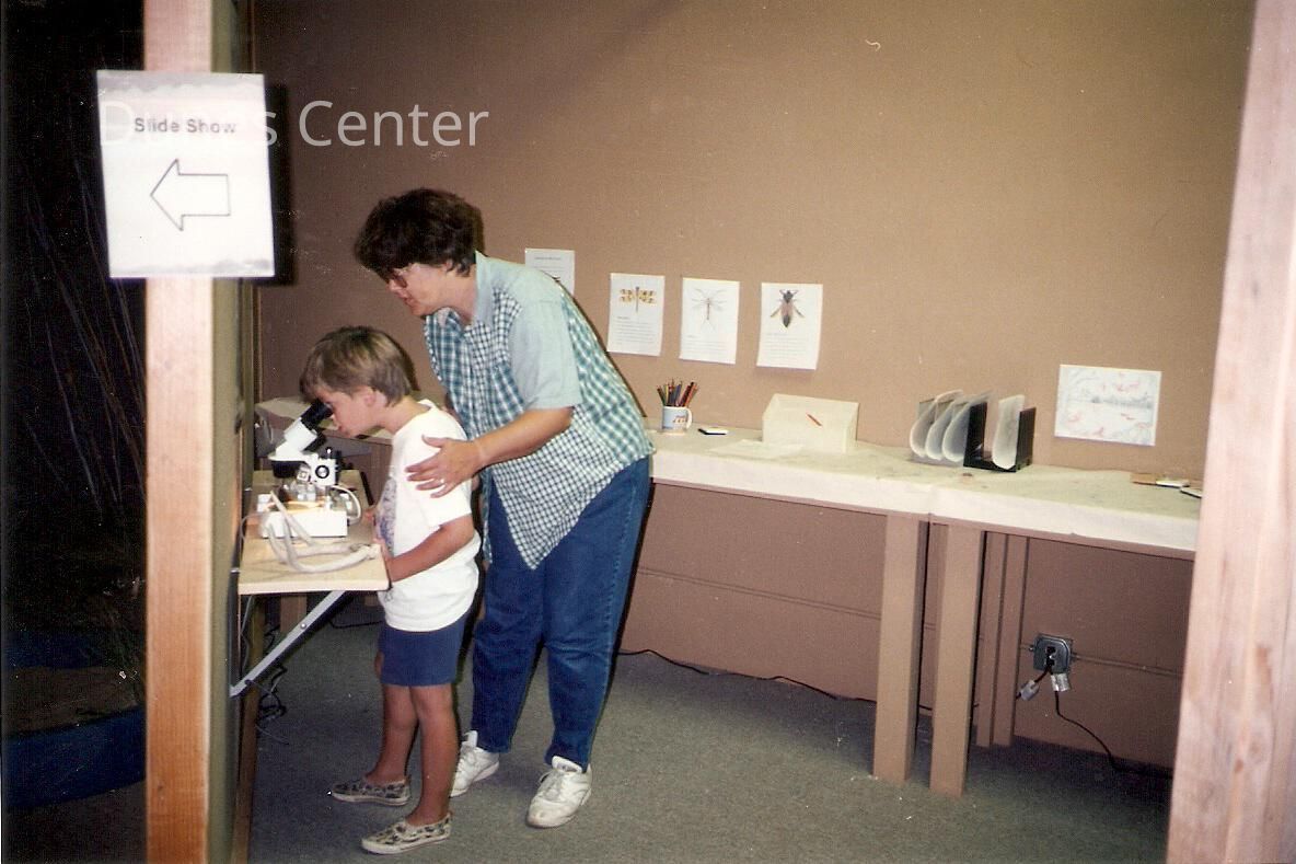 Dunes Discovery Center grand opening 10/13/96. Visitors study a slide in the children's room.