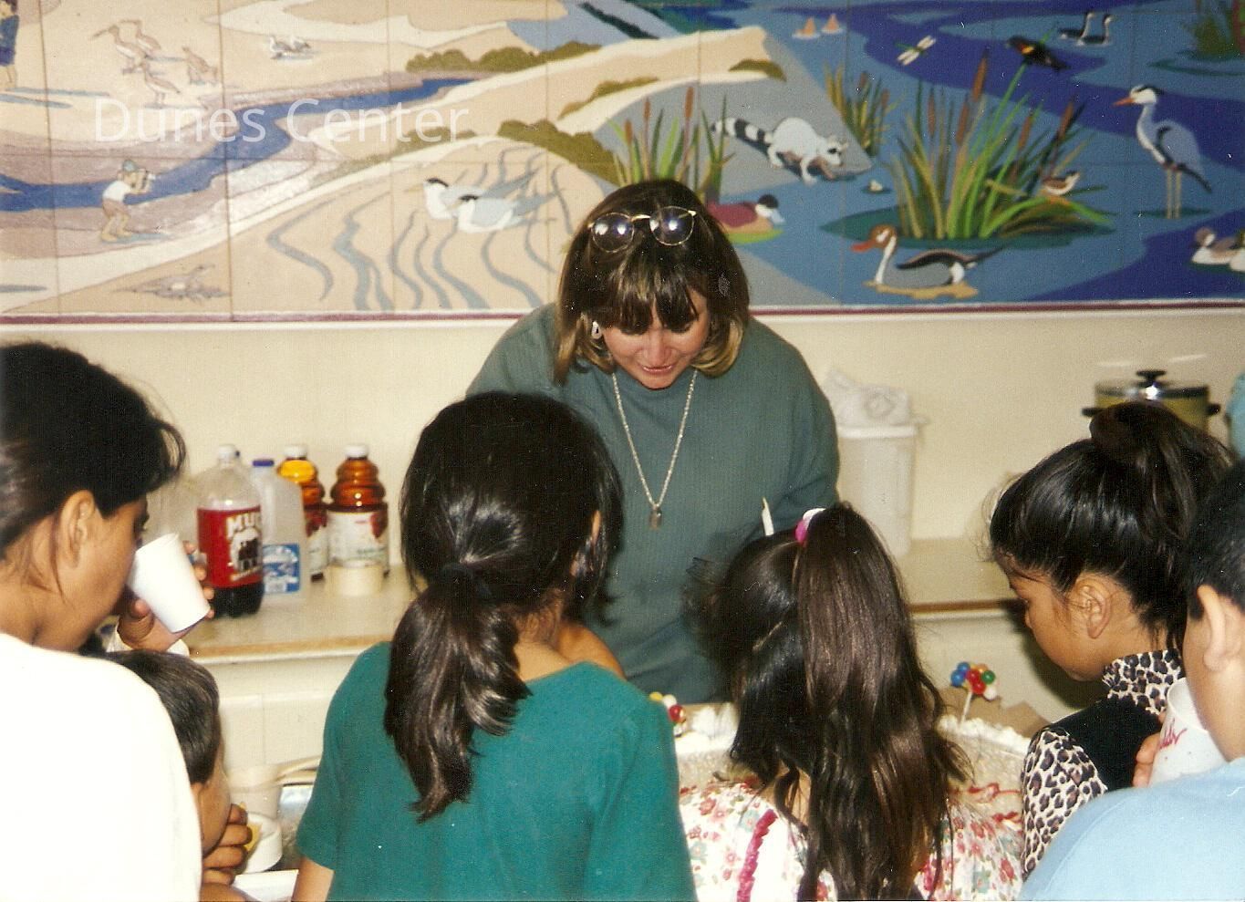 The Dunes Discovery Center 1st anniversary 10/1997. Karen Wood cuts the Dunes Discovery Center's first birthday cake.