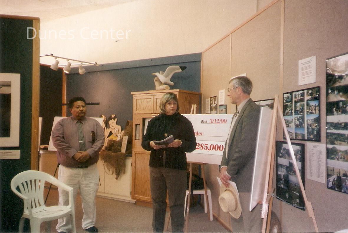 Presentation of Unocal Mitigation Funds 3/99. Sam Arca (mayor of guadalupe), Karen Wood (director of Dunes Discovery Center), Tom Urbanske (Santa Barbara County Supervisor).